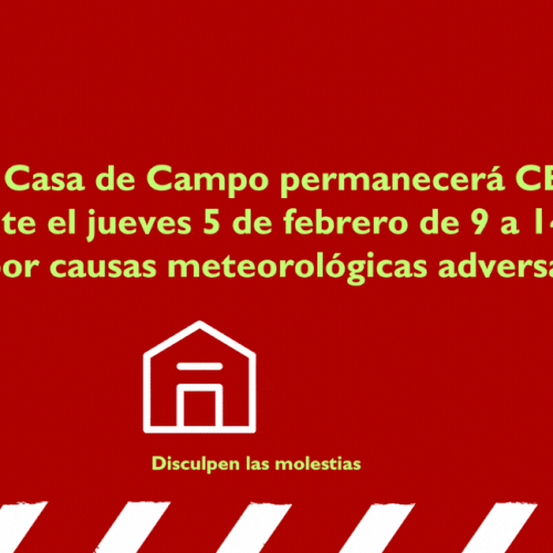 ¡AVISO IMPORTANTE! El Centro de Información y Educación Ambiental Casa de Campo permanecerá cerrado el jueves 5 de febrero de 9 a 14:30 horas por causas meteorológicas adversas, en virtud del protocolo de alertas meteorológicas del Ayuntamiento de Madrid aplicable a situaciones de alerta roja (y extrapolable a la Casa de Campo)