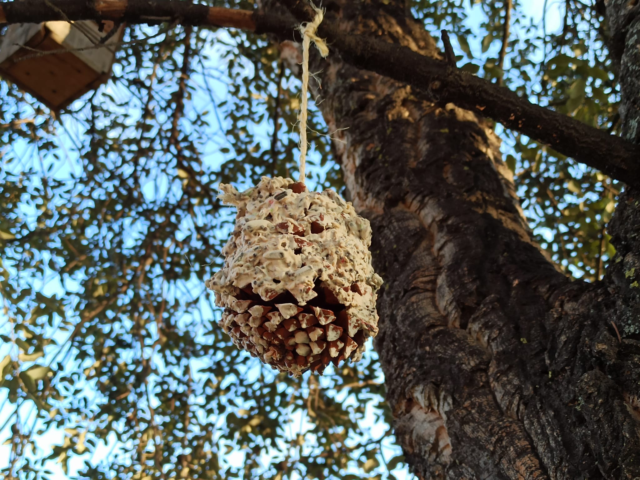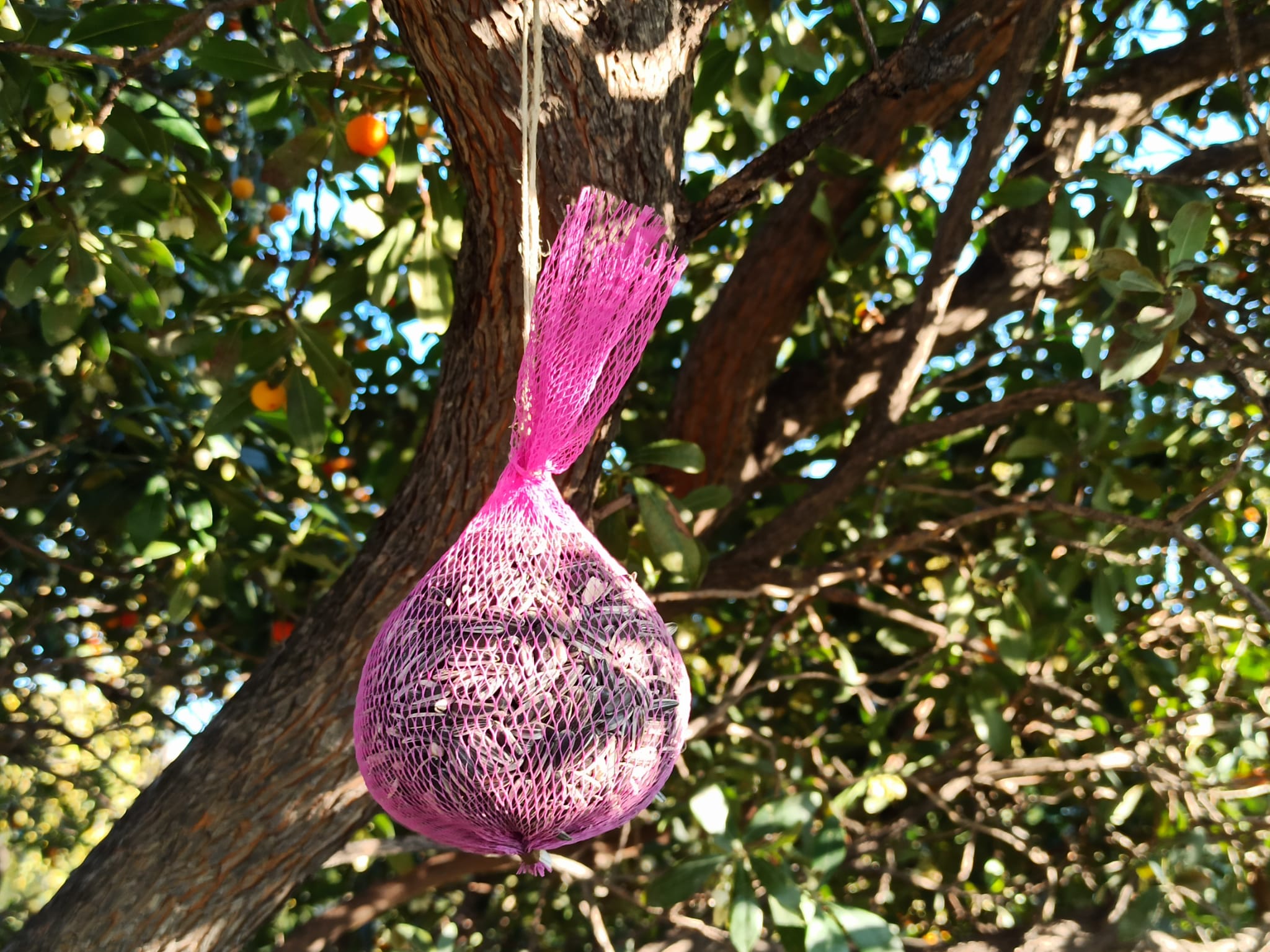 Existen muchos alimentos naturales que podemos ofrecerles, nosotros hemos usado alpiste, pipas de girasol y cacahuetes pero también podéis usar otros tipos de grano (avena, mijo, linaza, etc.), fruta o arroz y si es una mezcla de todos mejor, así cada especie tendrá donde elegir.