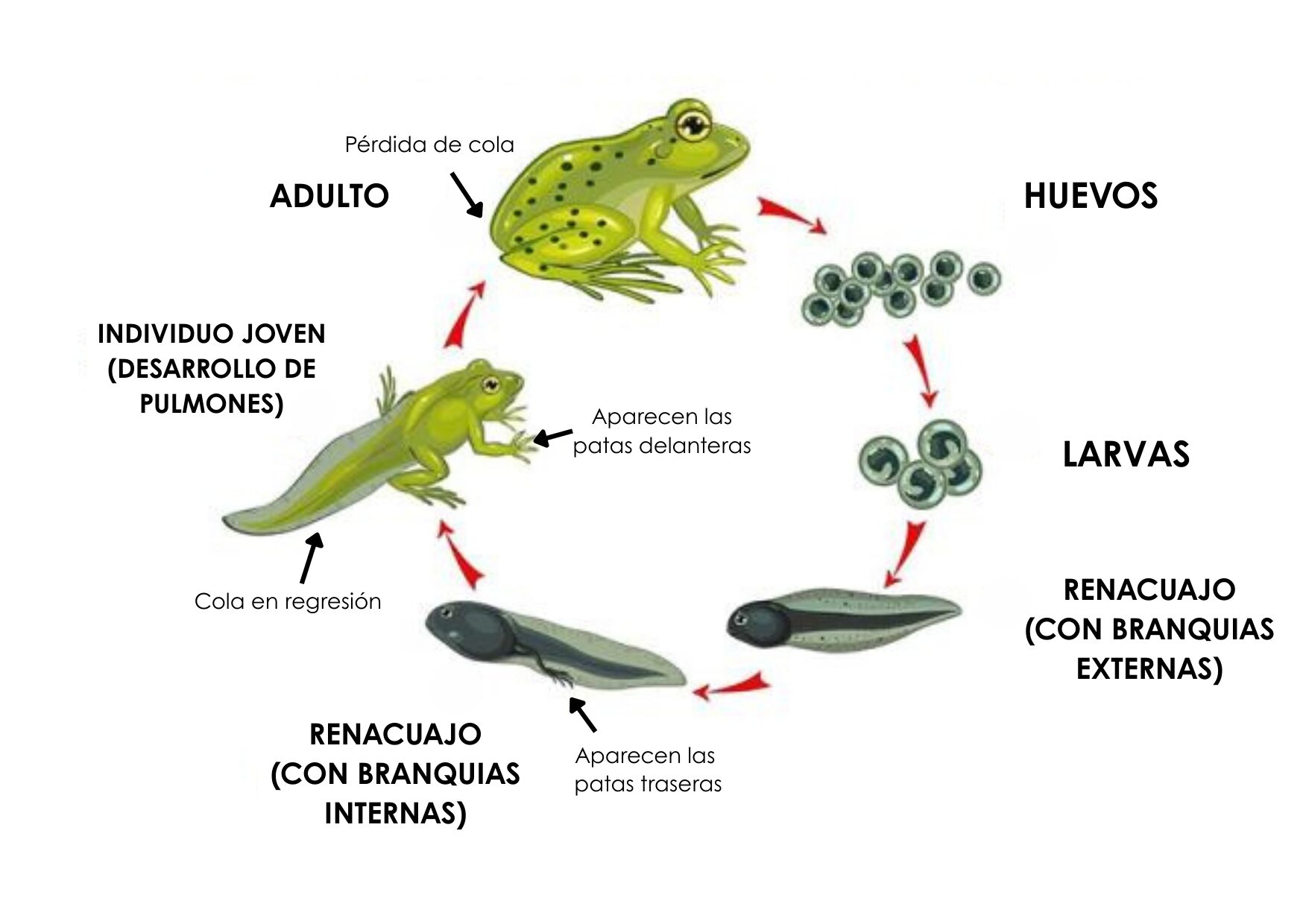 • A diferencia del resto de vertebrados, pasan por una metamorfosis; un proceso en el que la cría o larva experimenta una serie de cambios anatómicos y fisiológicos para llegar a adulto. En su ciclo de vida, primero tienen una etapa acuática como renacuajos, donde respiran por branquias y no tienen patas. Luego, al crecer, pasan a una etapa terrestre como adultos, con pulmones y patas desarrolladas.