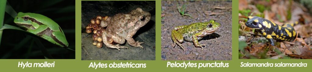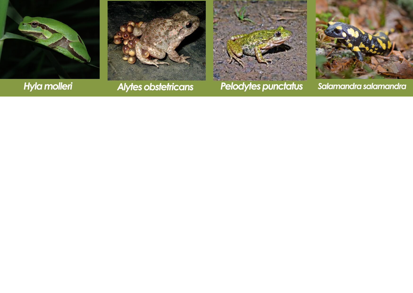 • Ranita de San Antonio ibérica (Hyla molleri): con su característico color verde, habita en humedales. Los machos emiten cantos reproductores de gran intensidad gracias a su gran saco vocal.