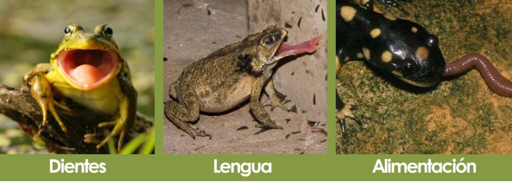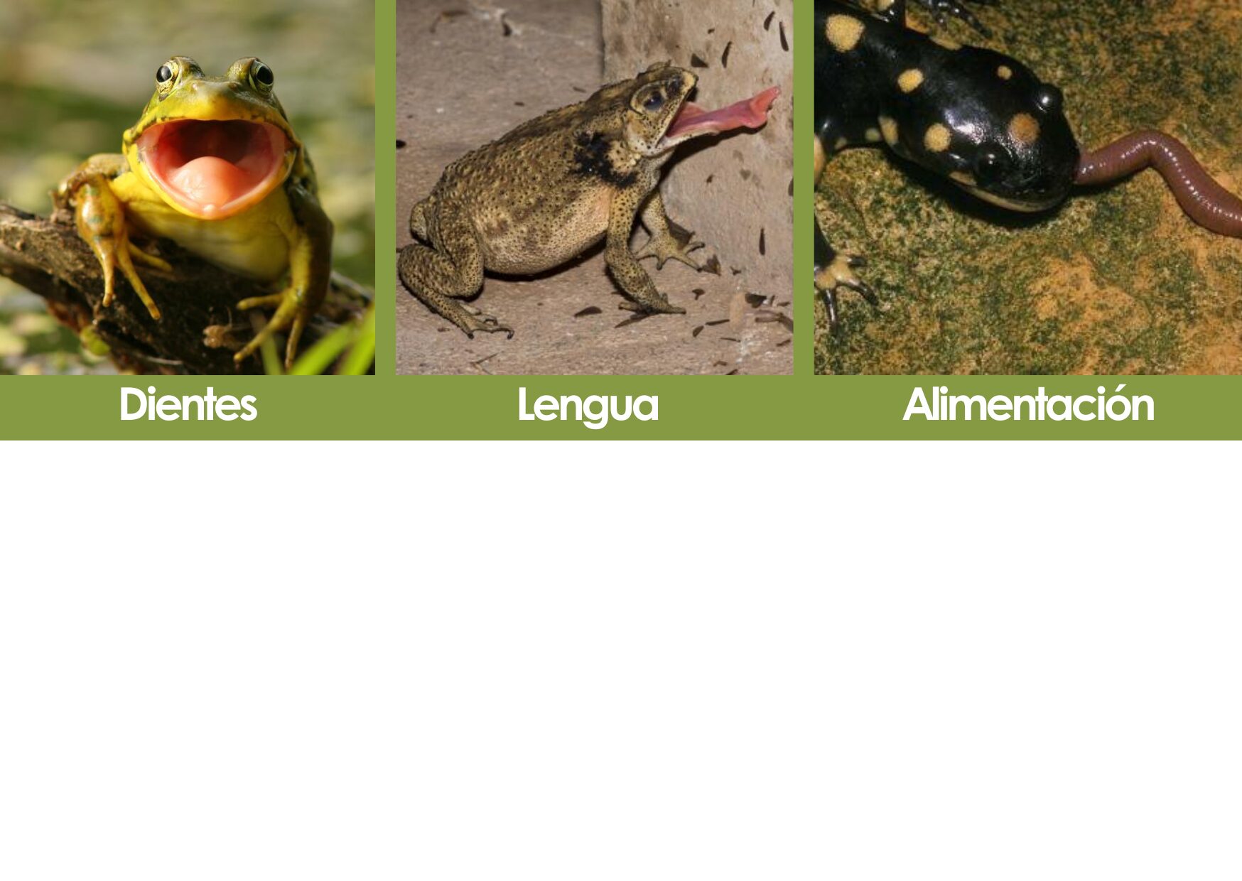 • Aunque no lo parezca, los anfibios tienen dientes, pero son muy pequeños y débiles, y se encuentran principalmente en la mandíbula superior. Estos dientes les sirven para sujetar a sus presas, pero no para masticarlas.