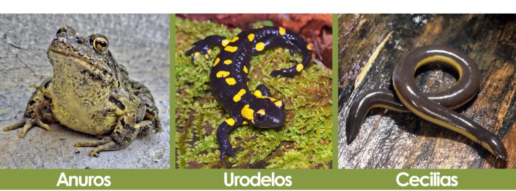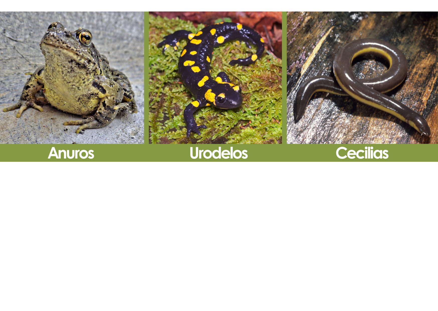Dentro del grupo de los anfibios podemos encontrar tres órdenes: Anura (ranas y sapos), Caudata o urodelos (salamandras y tritones), y Gymnophiona (cecilias).