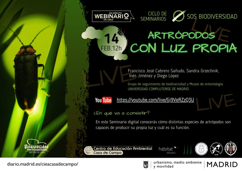 Impartido por D. Francisco José Cabrero Sañudo, Da. Sandra Grzechnik, Da. Inés Jiménez Fernández y D. Diego López– en colaboración con el Grupo de Seguimiento de Biodiversidad y el Museo de Entomología de la Universidad Complutense de Madrid-. En el seminario digital conocerás algunas especies de artrópodos que emiten luz y cuál es su función.