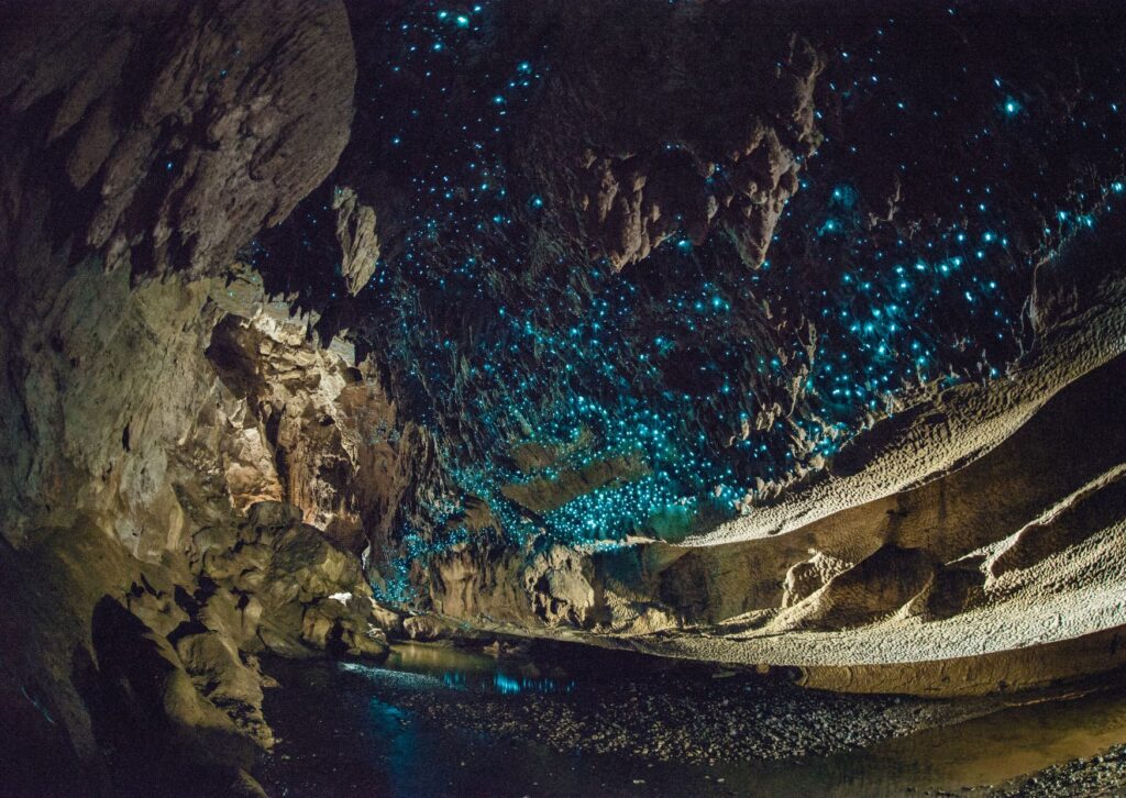 En países como Australia o Nueva Zelanda se pueden visitar unas cuevas repletas de «gusanos de luz», que son en realidad larvas de la mosca Arachnocampa flava que cuelgan de hilos pegajosos bioluminiscentes que les sirven para atraer y capturar presas: una larva hambrienta brilla más que una que acaba de comer.