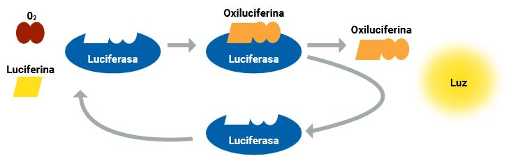 La bioluminiscencia es una reacción química en la que la enzima luciferasa, ayuda a unir un sustrato, la luciferina, y el oxígeno, creando luz y oxiluciferina y reutilizándose la luciferasa en cada ciclo. Se trata de la conversión de energía química en energía lumínica.
