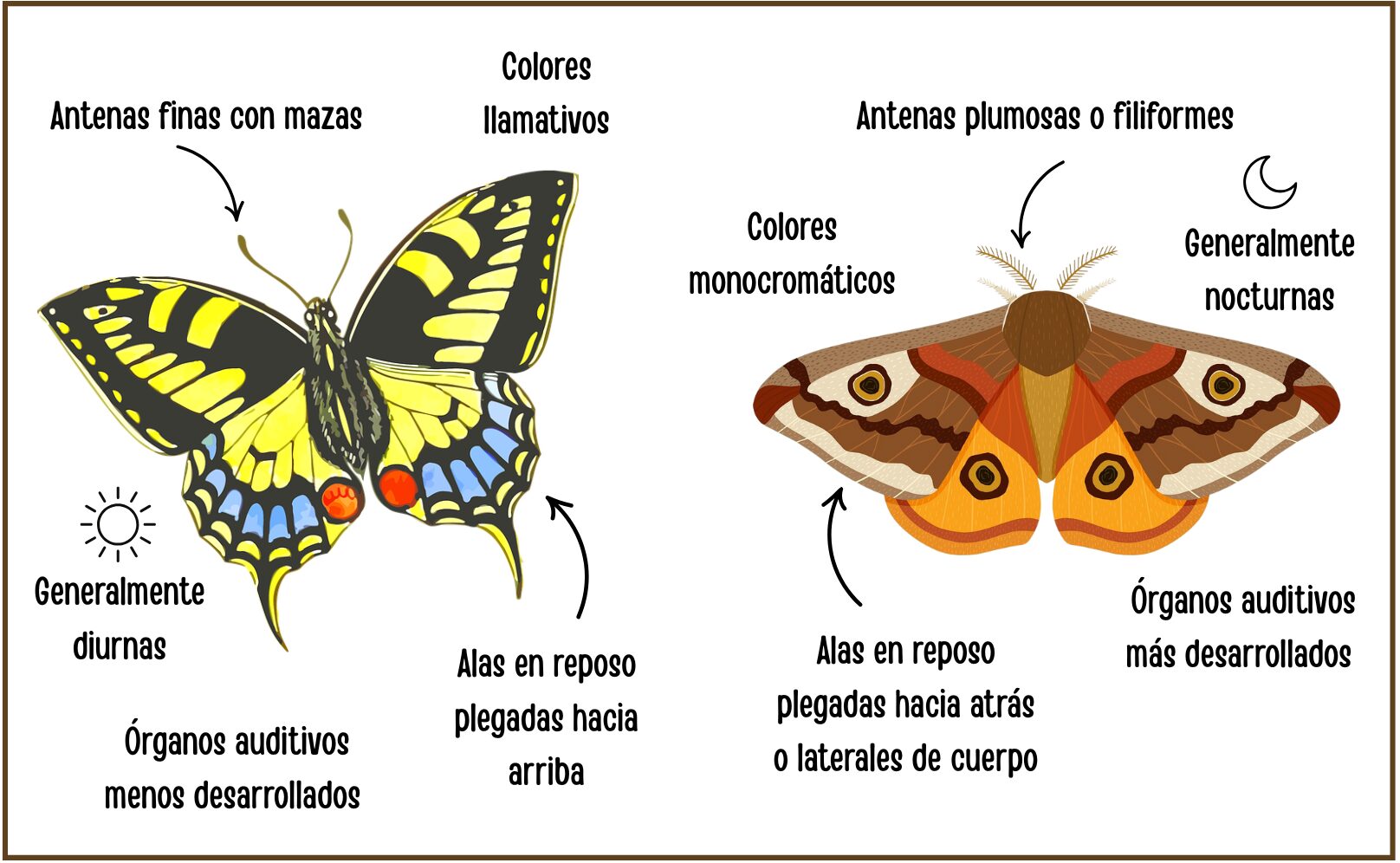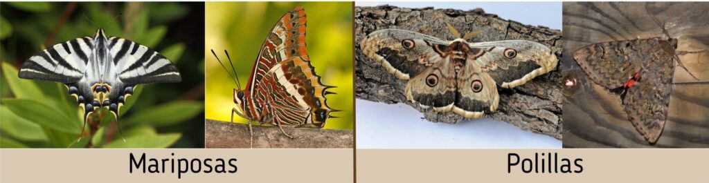 Aparte del número de especies, existen muchas diferencias entre polillas y mariposas. Éstas no se cumplen en todas las especies, por lo que no se pueden tomar como criterios absolutos para poder diferenciarlas. Pero en términos generales, podemos distinguir las siguientes características: