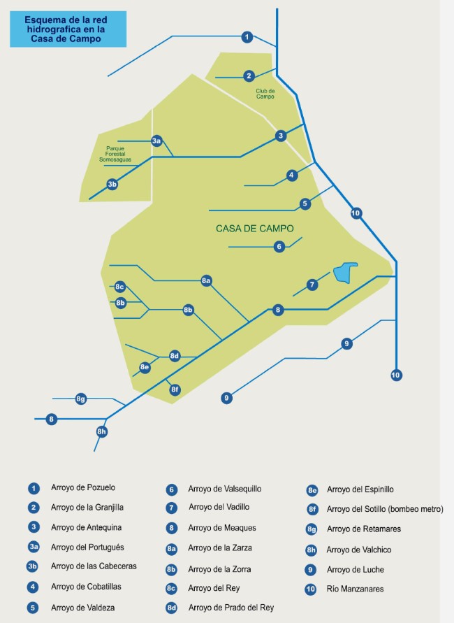 - en su zona central encontramos el Arroyo Valdeza (nº5 del mapa): nace en Casa de Campo y se nutre de aguas estacionales (con lo que se encuentra seco gran parte del año);