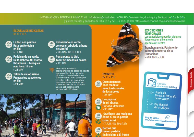Ya tenemos el Programa de actividades de los meses de abril, mayo y junio que el Ayuntamiento de Madrid organiza de manera gratuita a través de los Centros de Educación Ambiental municipales, donde podréis encontrar una amplia oferta de itinerarios, rutas de senderismo, talleres, seminarios, exposiciones, ponencias, eventos…