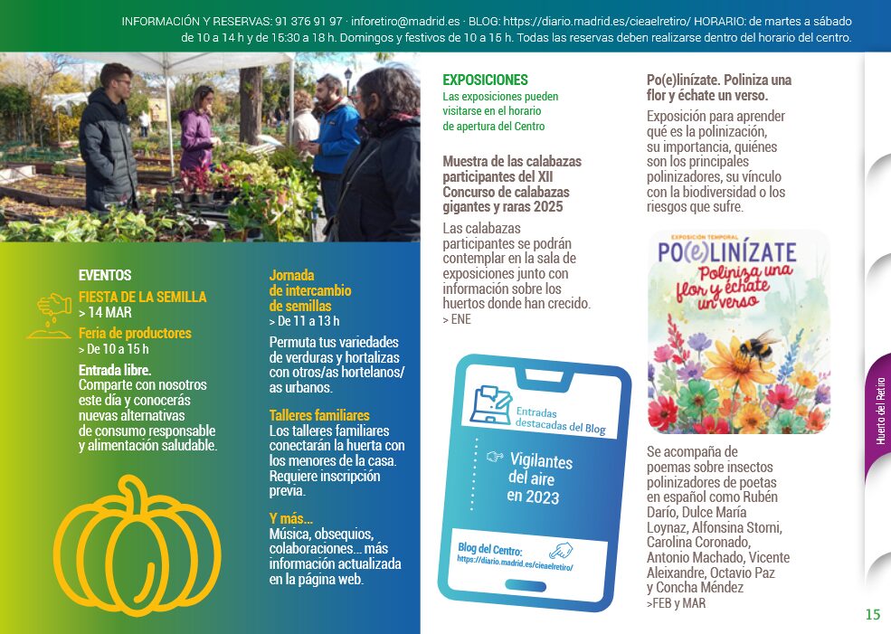 - Para recibir información actualizada de las actividades en las que quedan plazas disponibles, es imprescindible estar dado de alta en la base de datos del Huerto del Retiro.