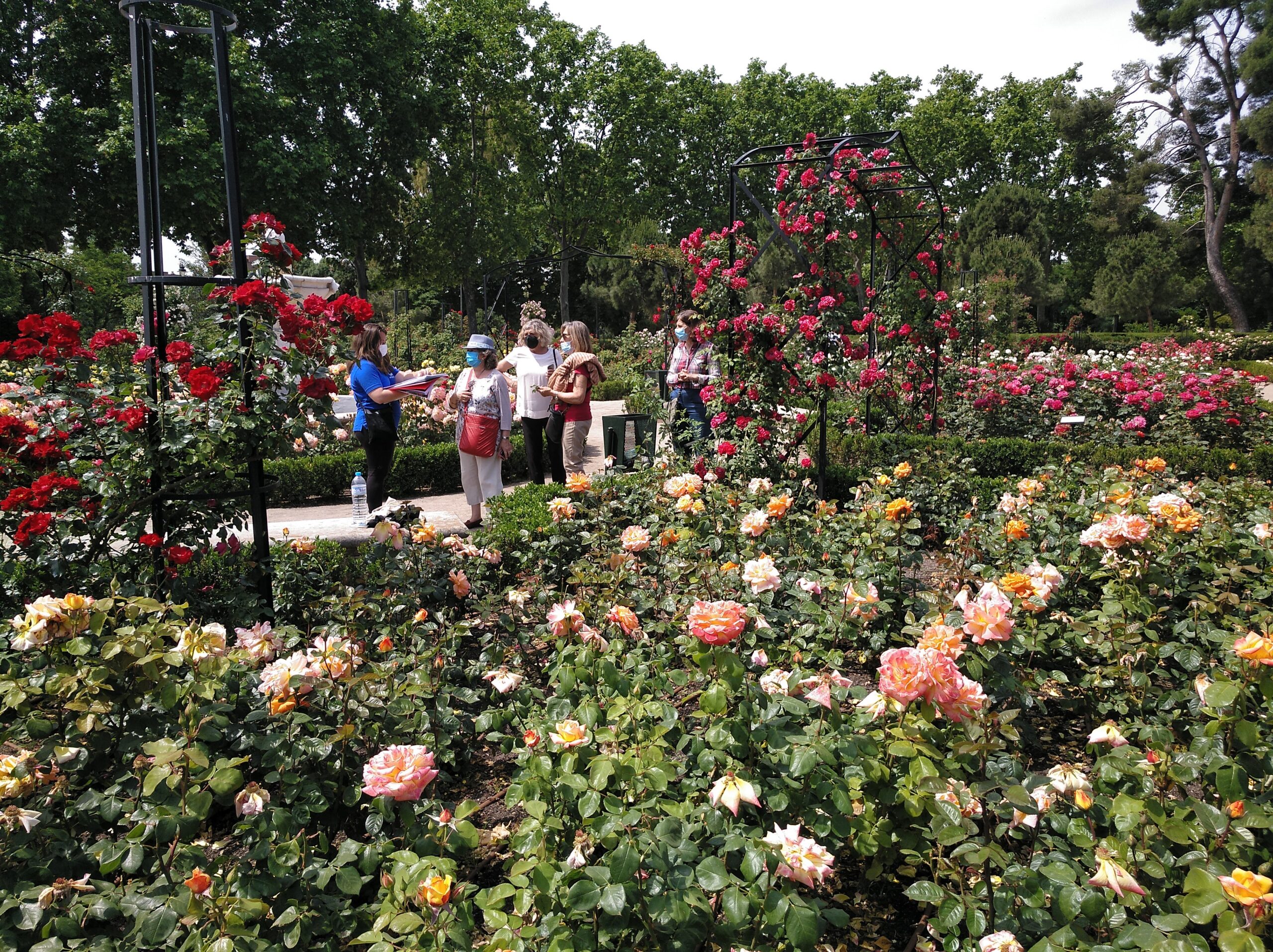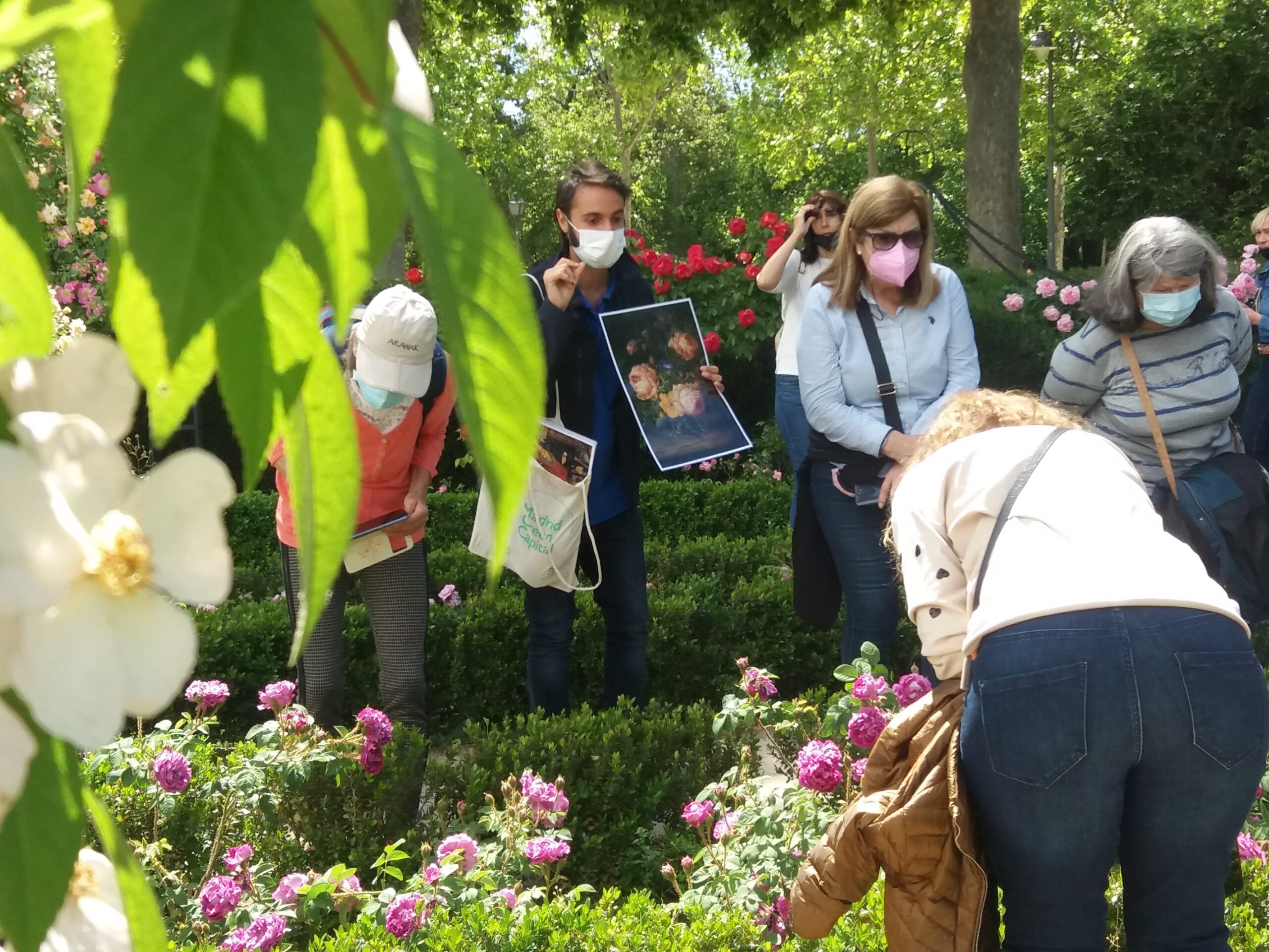 En esta visita se entra en la Rosaleda del Retiro que por estas fechas está en todo su esplendor. Se habla de la historia del cultivo de las rosas, que se remonta a hace más de treinta siglos. A partir de ahí se han ido cruzando variedades silvestres y obteniendo variedades cultivadas con los caracteres deseados en cada época según las modas y los gustos vigentes. La mejora de las técnicas de cultivo y las expediciones a Asia trajeron nuevos colores y formas a las variedades cultivadas en Europa. En la Rosaleda del Retiro se pueden ver ejemplos de rosales antiguos y modernos, con una gran diversidad de formas, colores y con múltiples ejemplos de lo que se apreciaba en cada momento de la historia del cultivo ornamental de rosas.