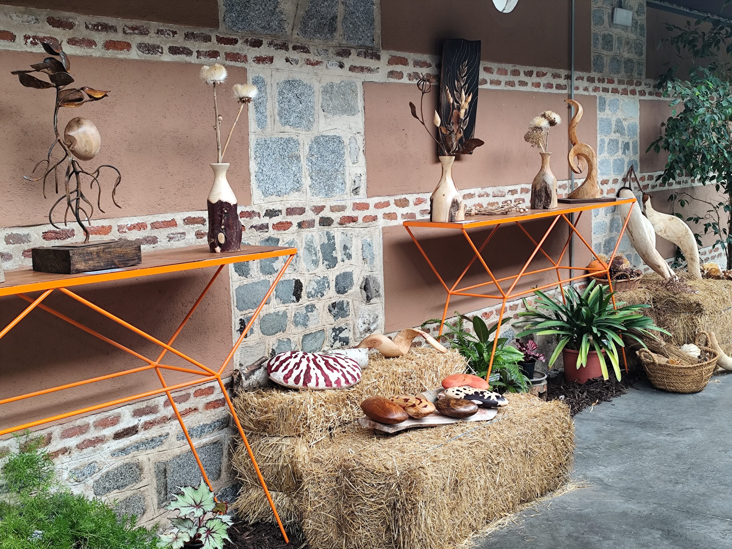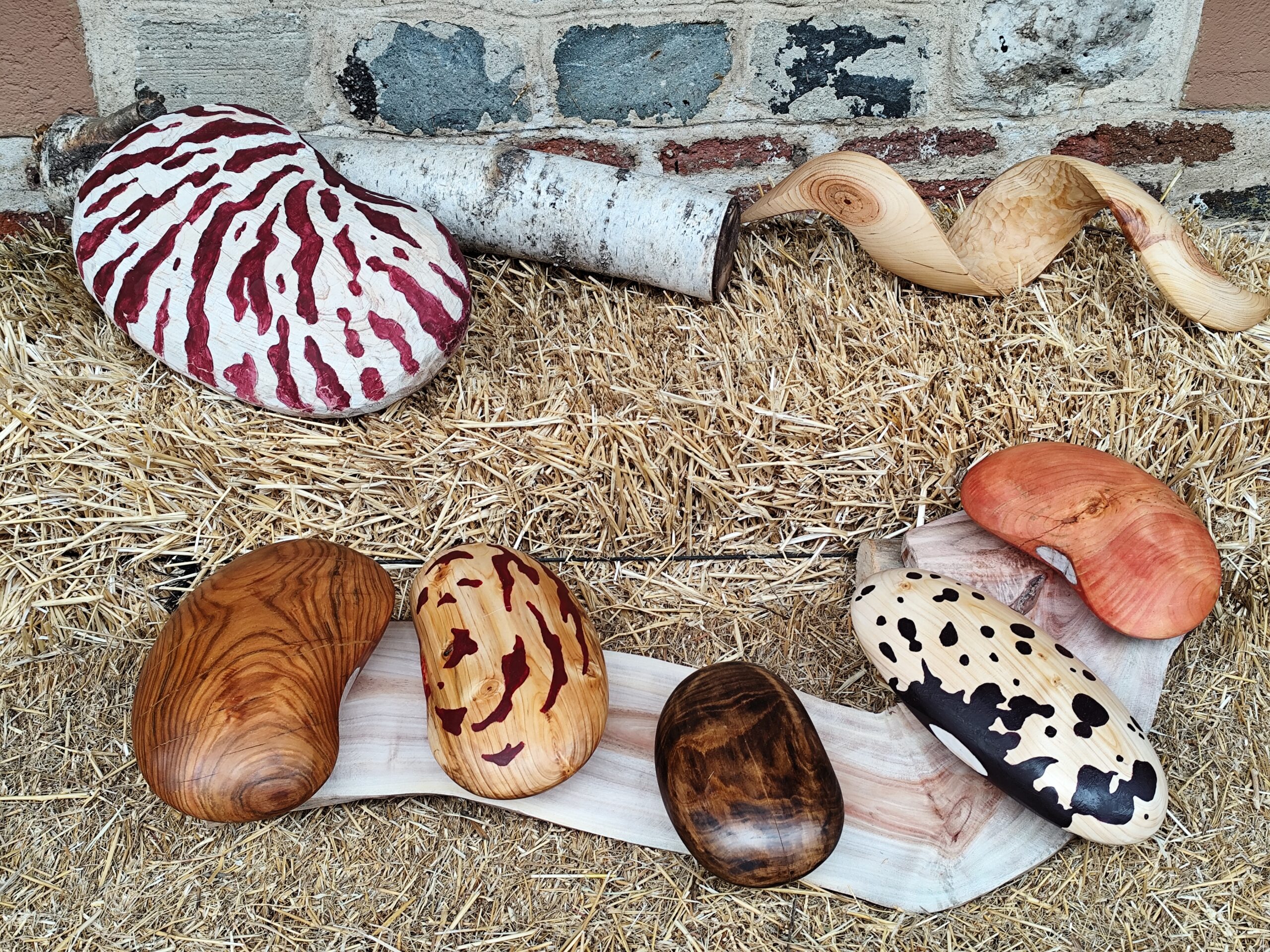Las piezas creadas exprofeso para esta exposición en el CIEA El Huerto del Retiro consisten en una interpretación muy personal sobre las semillas agrarias. Aprovechando maderas de diversos árboles ha tallado semillas de gran tamaño para que el público visitante pueda apreciar sus detalles, aquellos pormenores que pasan desapercibidos por su reducido tamaño ahora se convierten en desniveles, líneas curvas y rugosidades que aparecen evidentes y bellos al mismo tiempo.