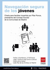 Durante la actividad se presentarán las Guías de Navegación Segura que ha editado el Consejo Escolar de la Comunidad de Madrid, en la que se expondrán los riesgos de Internet, el uso responsable de dispositivos móviles, el impacto del tiempo y las formas en las que utilizamos la red, y el papel que juegan los niños en las redes sociales. También se abordarán temas como las responsabilidades legales, la privacidad y más. Durante la charla, también se proporcionarán recursos para pedir ayuda en casos complicados y se abrirá un espacio de diálogo abierto con las familias para responder a sus dudas y preguntas.