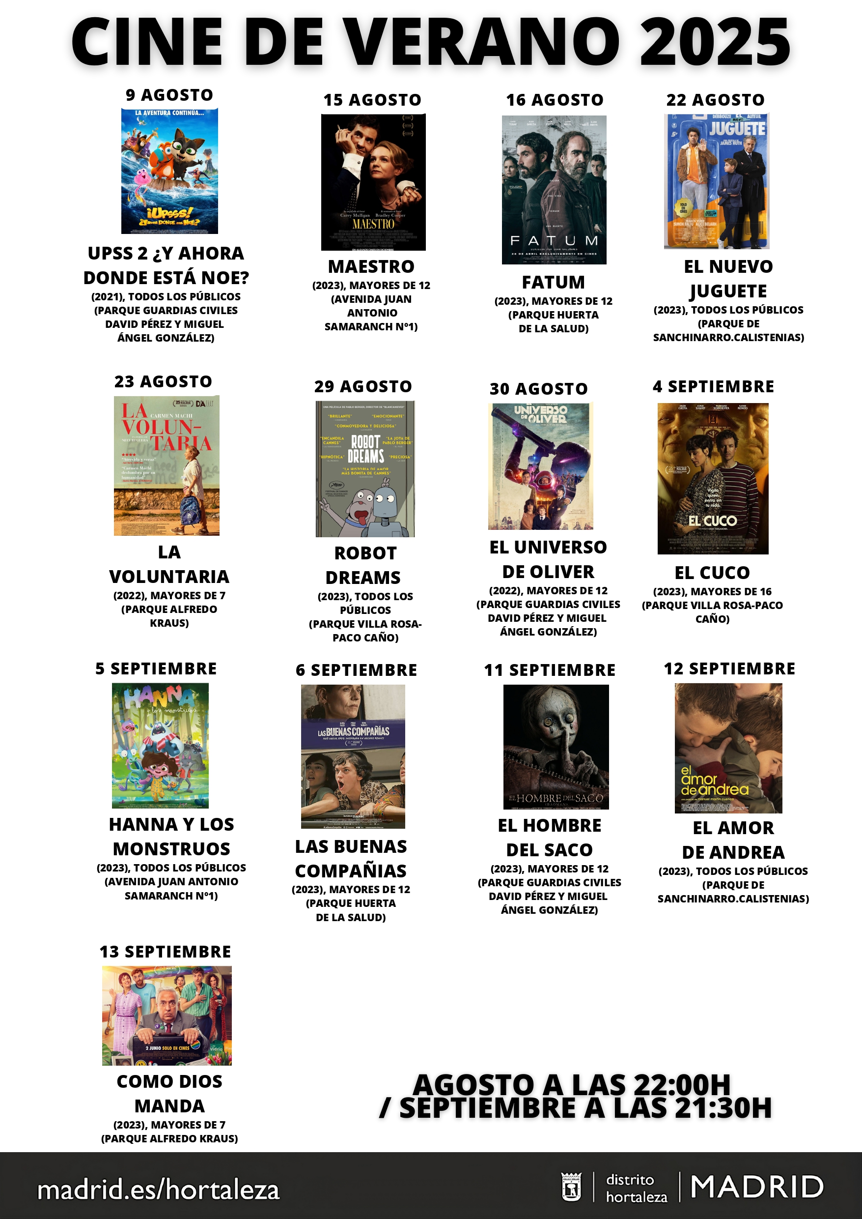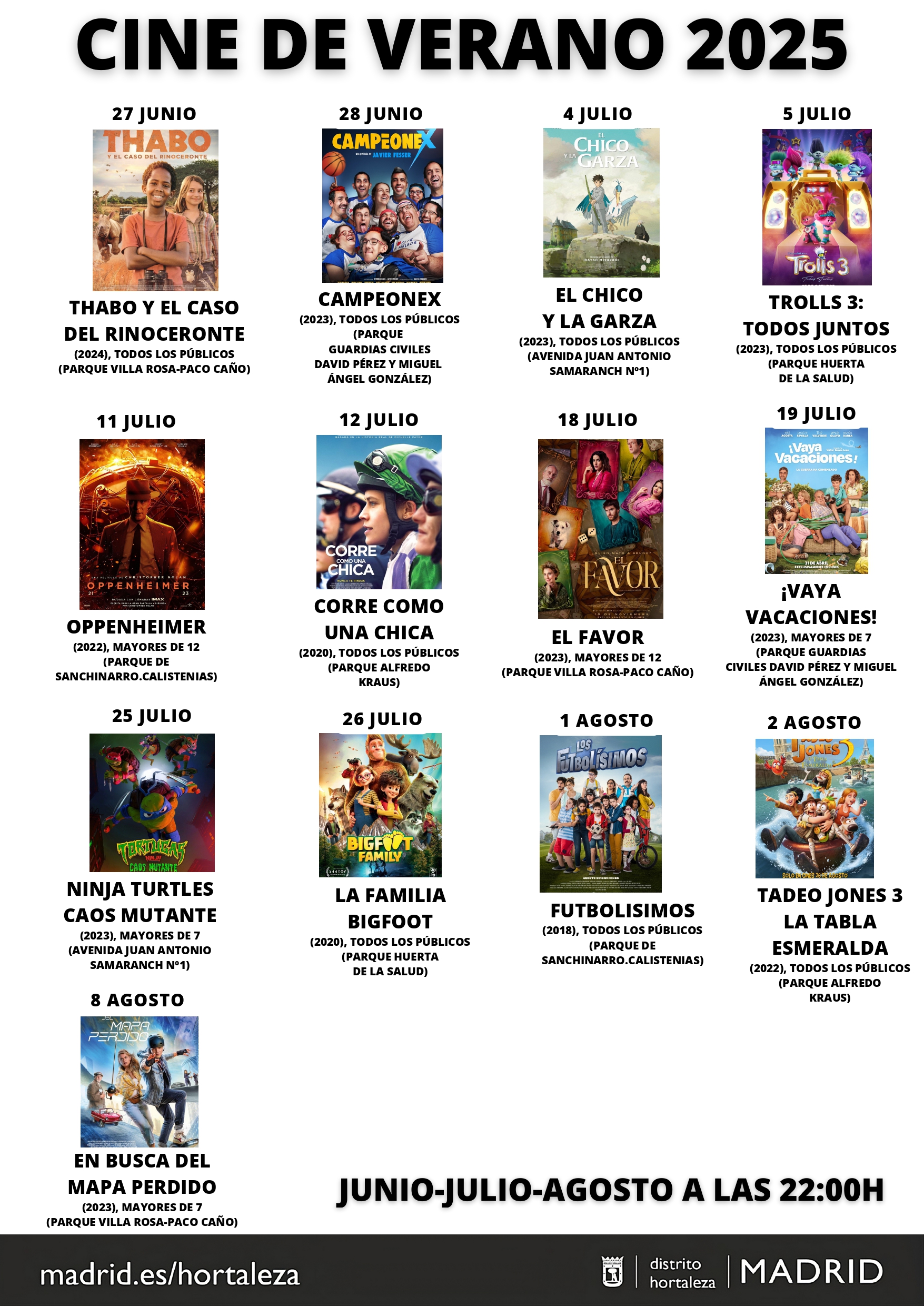 Las proyecciones serán en las siguientes ubicaciones: parque Villa Rosa-Paco Caño (calle de las Pedroñeras); parque de los Guardias Civiles David Pérez y Miguel Ángel González (calle de Dionisio Inca Yupanqui); avenida Juan Antonio Samaranch, 1 (Valdebebas); parque de la Huerta de la Salud (calle Mar de las Antillas); parque de Alfredo Kraus (calle del Mar Adriático, 5); y parque de Sanchinarro (avenida del Ingeniero Emilio Herrera con calle Isabel Clara Eugenia). Las películas comenzarán a las 22:00 h en junio, julio y agosto, y se adelantará a las 21:30 h en septiembre para adaptarse a la reducción de horas de luz.