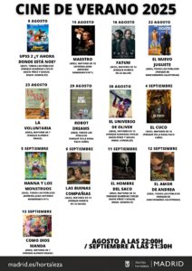 Prepara las palomitas… porque regresa al distrito una de las actividades más populares de la estación estival: el cine de verano, que este 2025 llega cargado de importantes novedades. Del 27 de junio al 13 de septiembre, seis parques de Hortaleza se convertirán en auténticas salas de cine para que esta propuesta cultural llegue a todos los barrios, con sesiones todos los viernes y los sábados, además de dos adicionales los jueves 4 y 11 de septiembre.