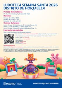 Con las vacaciones de Semana Santa en ciernes, la Junta Municipal de Hortaleza vuelve a organizar un año más una ludoteca gratuita con 156 plazas para favorecer la conciliación familiar y laboral durante este periodo. Como en años anteriores, se desarrollará en los centros culturales Carril del Conde, Hortaleza y Federico Chueca, y las inscripciones ya pueden realizarse en el siguiente enlace, hasta el próximo 1 de marzo.