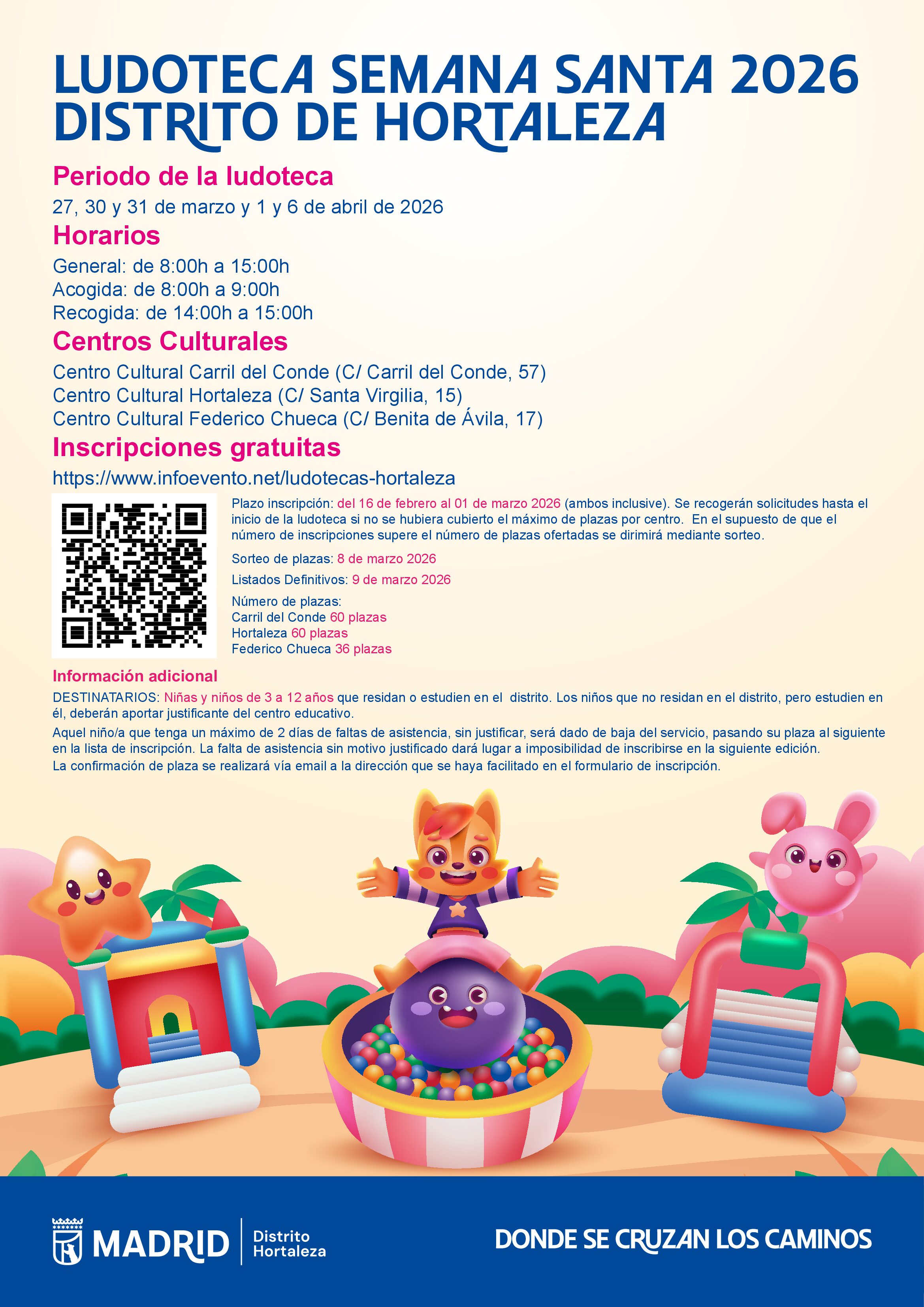 La ludoteca se desarrollará los días 27, 30 y 31 de marzo y 1 y 6 de abril, en horario de 08:00 a 15:00 h, siendo la acogida de 08:00 a 09:00 h y la recogida de 14:00 a 15:00 h. Los centros culturales Carril del Conde (60 plazas), Hortaleza (60 plazas) y Federico Chueca (36 plazas) ofrecerán actividades lúdicas, educativas y culturales para niños y niñas de 3 a 12 años que estudien o residan en el distrito.