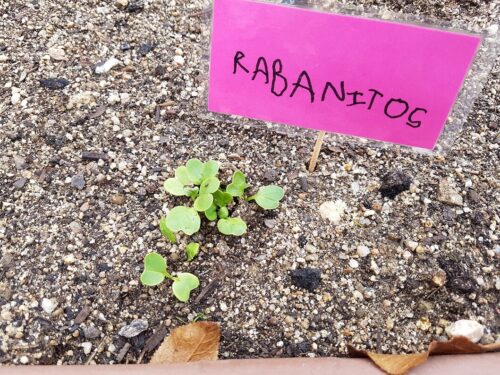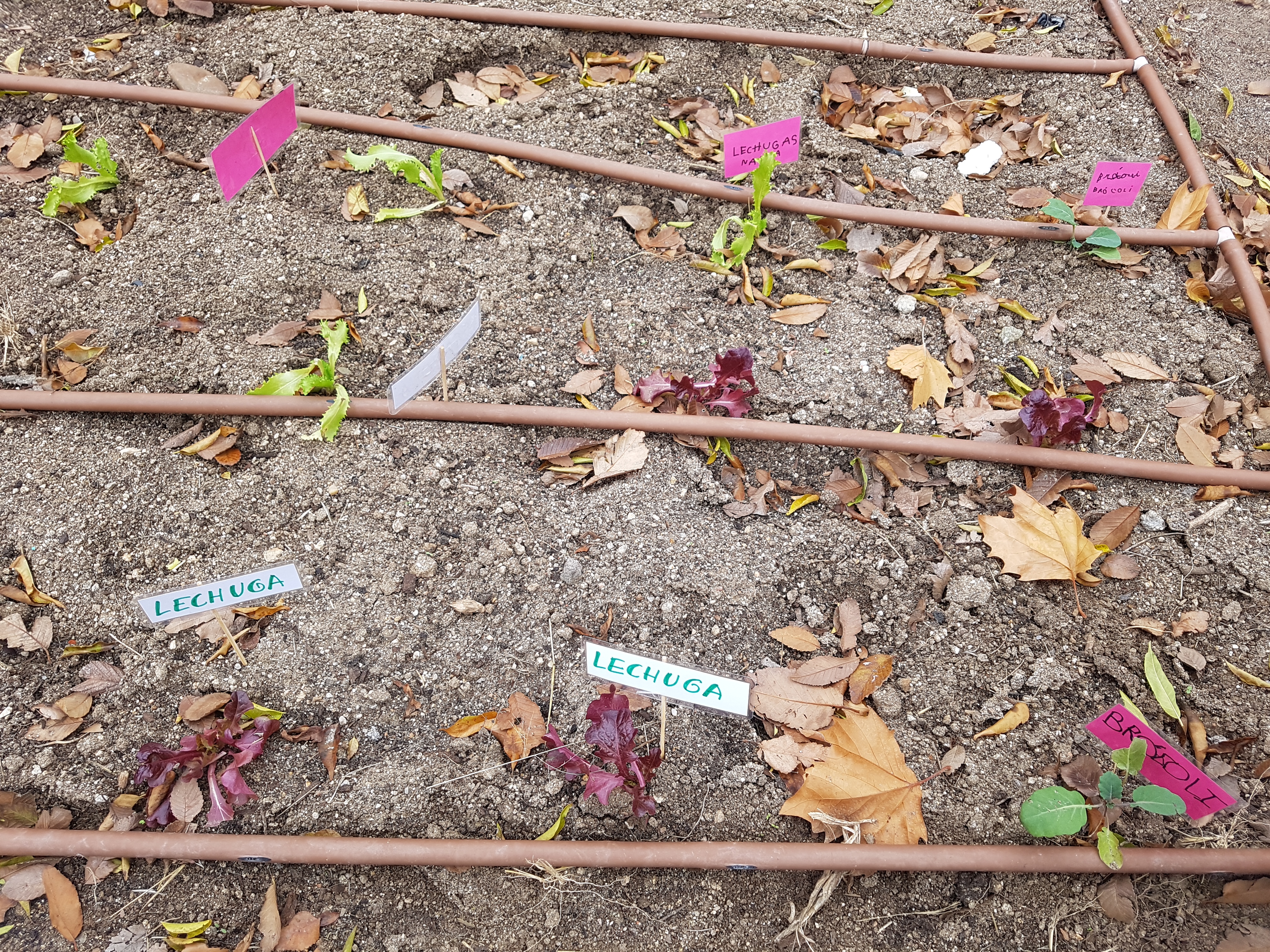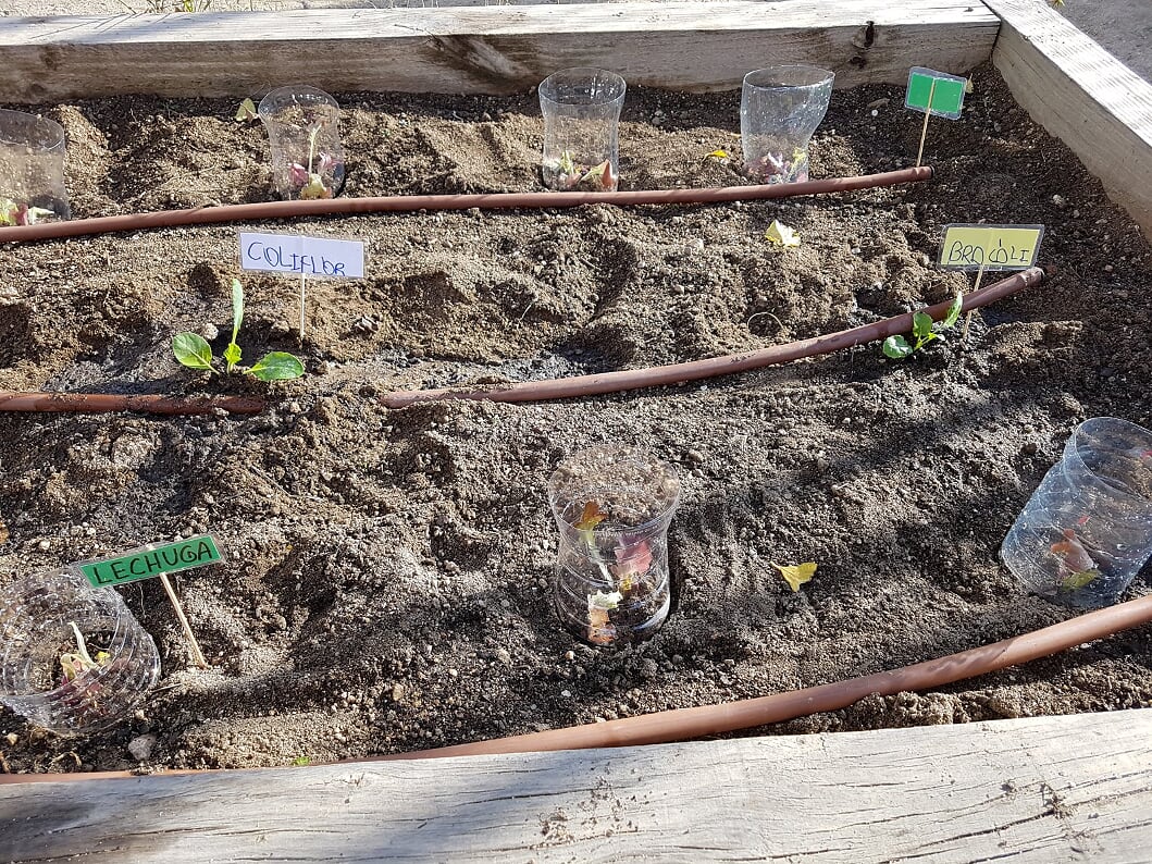 <<Este trimestre en el CEIP Loyola de Palacio hemos estado plantando los cultivos que nos han llegado desde el Ayuntamiento. Lechugas de distintos tipos, de hoja de roble y escarola, brócolis y coliflores de gran porte intercalando las lechugas y remolachas de menor porte entre medias. Algunas alcachofas que van a hacerse muy grandes y acelgas junto a zanahorias y rabanitos. Pusimos acelgas con siembra directa que aunque es más lento hemos visto que al final sí salen varias plantitas, y también plantamos acelga en plantón. A algunas lechugas le pusimos protección con botellas cortadas para protegerlas del frío y de posibles caracoles o babosas. Imprescidible es señalizar todo lo que sembramos, sobre todo cuando es con semilla que tarda más en salir. La mayoría de los carteles son caseros hechos por los niños y plastificados para que aguanten a la intemperie.