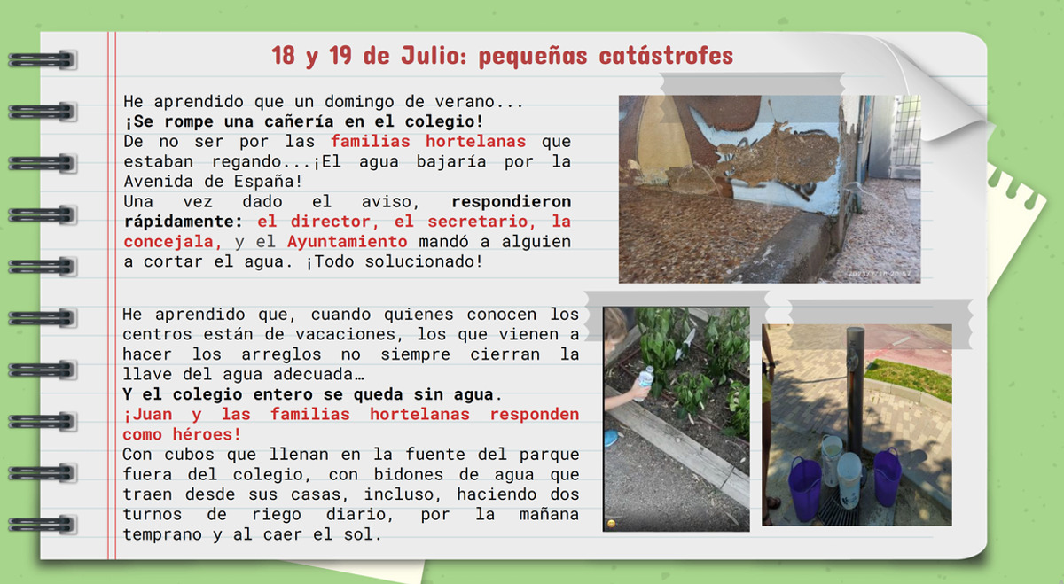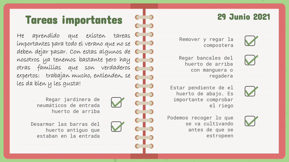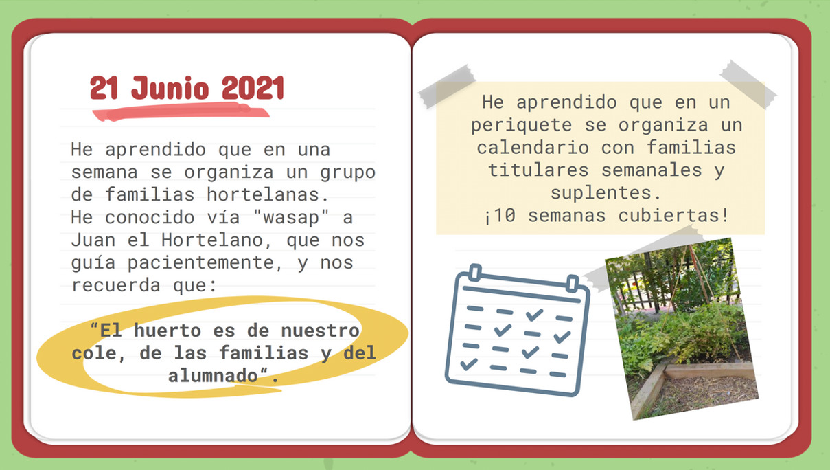 Una de las familias que ha estado participando en el cuidado del huerto durante este pasado verano, ha elaborado un pequeño cuaderno-memoria de sus aprendizajes en el huerto. Y nos parece una idea preciosa para compartir. Dejamos por aquí algunas de las cosas que esta familia ha aprendido en el huerto durante este verano.