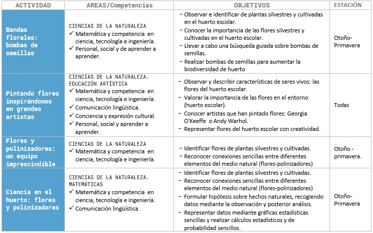 ¿Qué hacen los insectos cuando van a las flores? ¿Qué insectos polinizadores habrá en un huerto o jardín? ¿Necesitamos flores y polinizadores en el huerto? Con la guía y ayuda de una ficha técnica el alumnado investigara que flores y polinizadores están presentes en el huerto escolar, tratando de responder a esas y otras preguntas. Descarga AQUÍ la actividad: FLORES Y POLINIZADORES: UN EQUIPO IMPRESCINDIBLE.