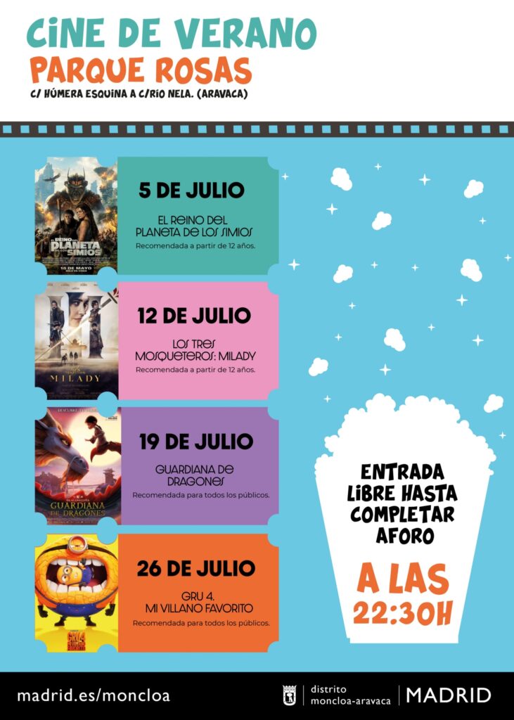 Este verano tienes una cita ineludible en Aravaca. Durante los meses de julio y agosto te ofrecemos la mejor cartelera de cine al aire libre en la calle Río Nela, dentro del Parque Rosas. Las sesiones son de acceso libre, por lo que te recomendamos acudir con antelación para encontrar un buen sitio.