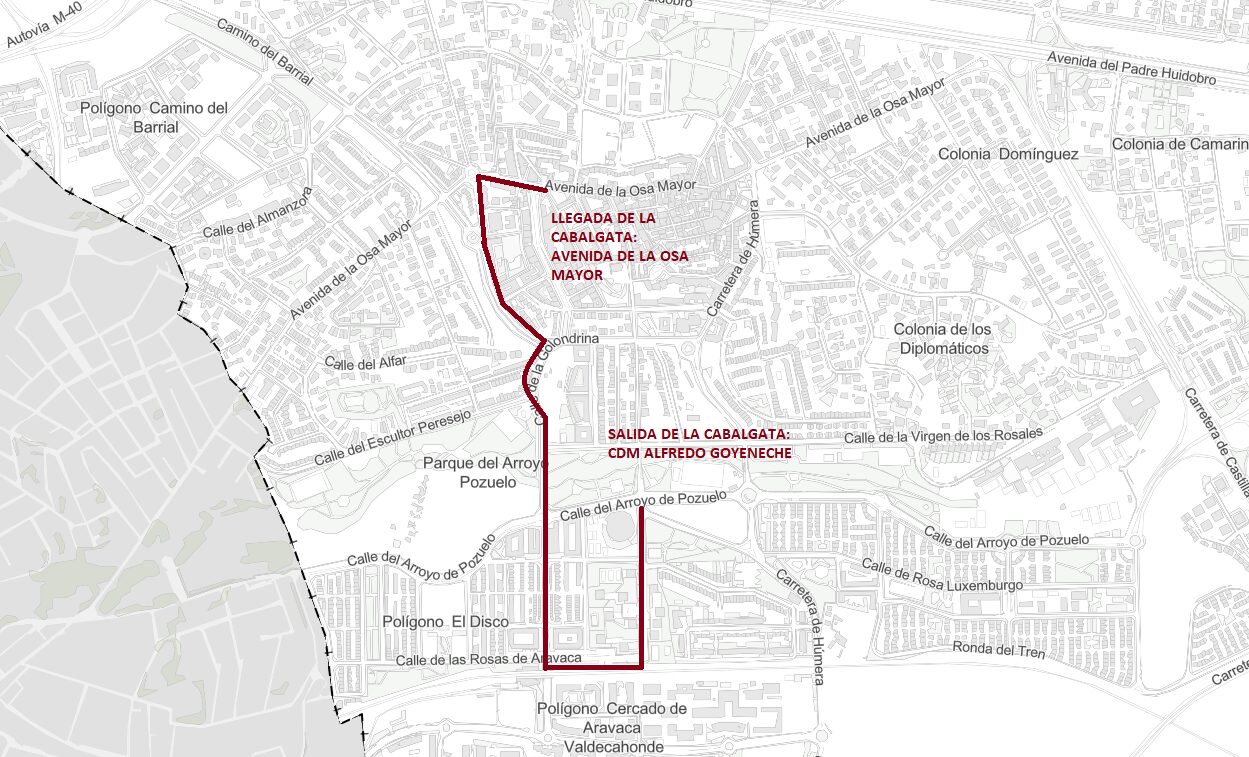 Cubriendo una distancia aproximada de 3,4 kilómetros, la cabalgata partirá desde las inmediaciones del Centro Deportivo Municipal Alfredo Goyeneche a las 18.30 para continuar por las calles de Húmera, Las Rosas de Aravaca, La Golondrina, Acamar, plaza de la Corona Boreal, para finalizar en la avenida de la Osa Mayor, a la altura de la calle Pérez de la Victoria.