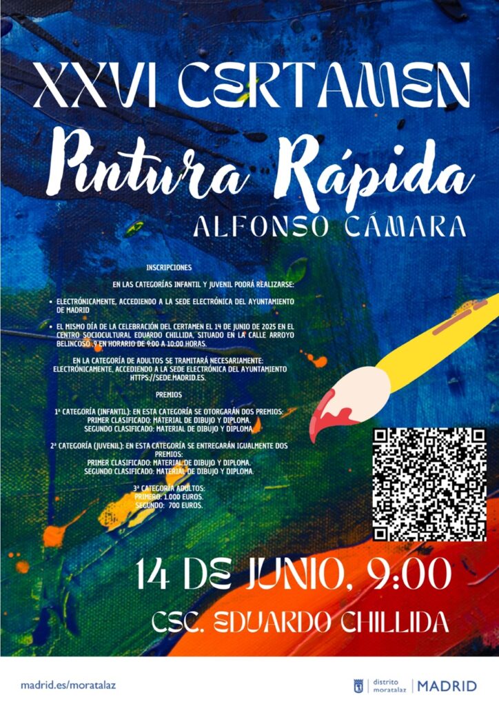 Con la finalidad de promover la cultura a través de los valores pictóricos, llega la vigésimo sexta edición del Certamen de Pintura Rápida Alfonso Cámara del distrito de Moratalaz. Una jornada de pintura al aire libre que se desarrollará el sábado 14 de junio, para la que es necesario inscribirse en cualquiera de sus tres categorías: infantil, hasta 11 años cumplidos; juvenil, entre los 12 y 17 años, y adultos, para personas con más de 18.