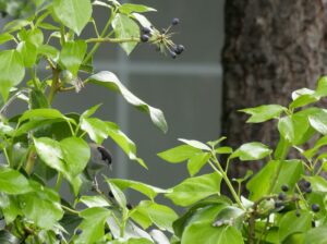 Una pareja de currucas capirotadas (Sylvia atricapilla) -la hembra con el capirote pardo y el macho, negro- aparecieron poco después sobre una valla tapizada de hiedra de cuyas bayas se estaban alimentando, hasta que un mirlo común (Turdus merula) los espantó.
