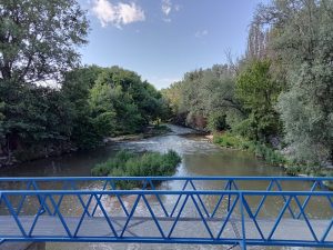 Llegados al río nos detuvimos en varios de los puentes que nos hacen de punto de observación aguas arriba y aguas abajo. No tuvimos la suerte más que de ver alguna gallineta (Gallinula chloropus), escuchar a un ruiseñor bastardo (Cettia cetti) y a otro que más abajo le respondía y también el vuelo de milanos negros (Milvus migrans) muy arriba en el cielo.