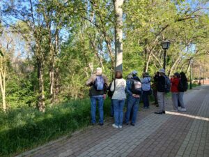 [Imagen 1. El grupo prestando atención a las aves del bosque de ribera. Fuente: Madrid Ambiental]