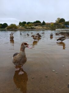En el estanque nadaban ánades reales (Anas platyrhynchos) junto a un grupo de quince gansos del Nilo (Alopochen aegyptiaca), que si ninguna vergüenza se nos acercó. Algunos hasta se arrimaron a dos metros de distancia. No teníamos pan, como es lógico. Teníamos ganas de ver su plumaje y su comportamiento. Lo vimos. Todo un despliegue de marrones y blancos con partes verdes oscuras.