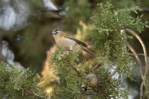 Volvimos de la zona acuática y nos dirigimos al pinar, pero en una arizónica (Cupressus arizonica) unas aves inquietas nos llamaban con su poco contenido movimiento. Eran carboneros garrapinos (Periparus ater). No se veían bien y estuvimos un rato esperando para que bajaran a las ramas bajas del árbol. Entre tanto vino cantando otra ave con un canto destacado, era un herrerillo capuchino (Lophophanes cristatus) que grácil también pudimos ver claramente. Y esta espera nos reconfortó con la presencia final, después de la de un carbonero común (Parus major), de un macho de reyezuelo listado (Regulus ignicapilla). Este árbol y esa espera merecieron la visita en la que solo nos cayó agua ligera durante los primeros veinte minutos.