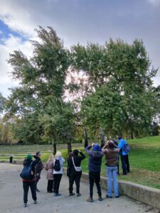 [Imagen 3. Grupo buscando entre las ramas de un álamo gris (Populus x canescens). Fuente: Madrid Ambiental.]