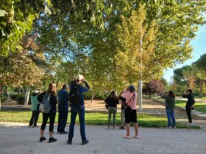[Imagen 3. Grupo de asistentes a la actividad disfrutando la presencia de un petirrojo. Fuente: Madrid Ambiental]