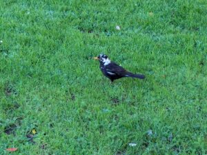Y así fue. El primero que apareció fue un mirlo (Turdus merula), al cual mirando con detenimiento nos percatamos de que tenía varias plumas blancas, se trataba de un mirlo que mostraba leucismo parcial. El leucismo parcial es una condición que muestran algunos animales en los que no se genera melanina en determinadas partes del cuerpo.