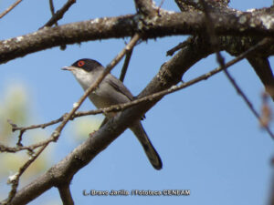 En este mismo emplazamiento, sobre las ramas de un árbol próximo localizamos una curruca cabecinegra (Sylvia melanocephala).Al principio sospechamos de la capirotada, pero el iris rojizo que luce nos saca de cualquier duda.