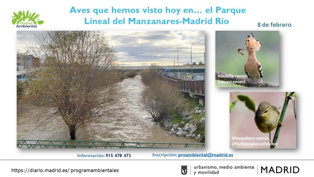 El río Manzanares presentaba un caudal elevado tras las lluvias recientes, con las orillas parcialmente inundadas y sin las habituales isletas de sedimentos. Aun así, el río no dejó de ofrecernos observaciones de aves acuáticas, como un veloz ánade azulón (Anas platyrhynchos), varios cormoranes grandes (Phalacrocorax carbo), algunos con plumaje blanco en el cuello indicativo de la época reproductora, y una gallineta común (Gallinula chloropus) que llevaba un trozo de pan en el pico. Aprovechamos la escena para recordar que no debemos alimentar a las aves que habitan las zonas verdes de nuestra ciudad.