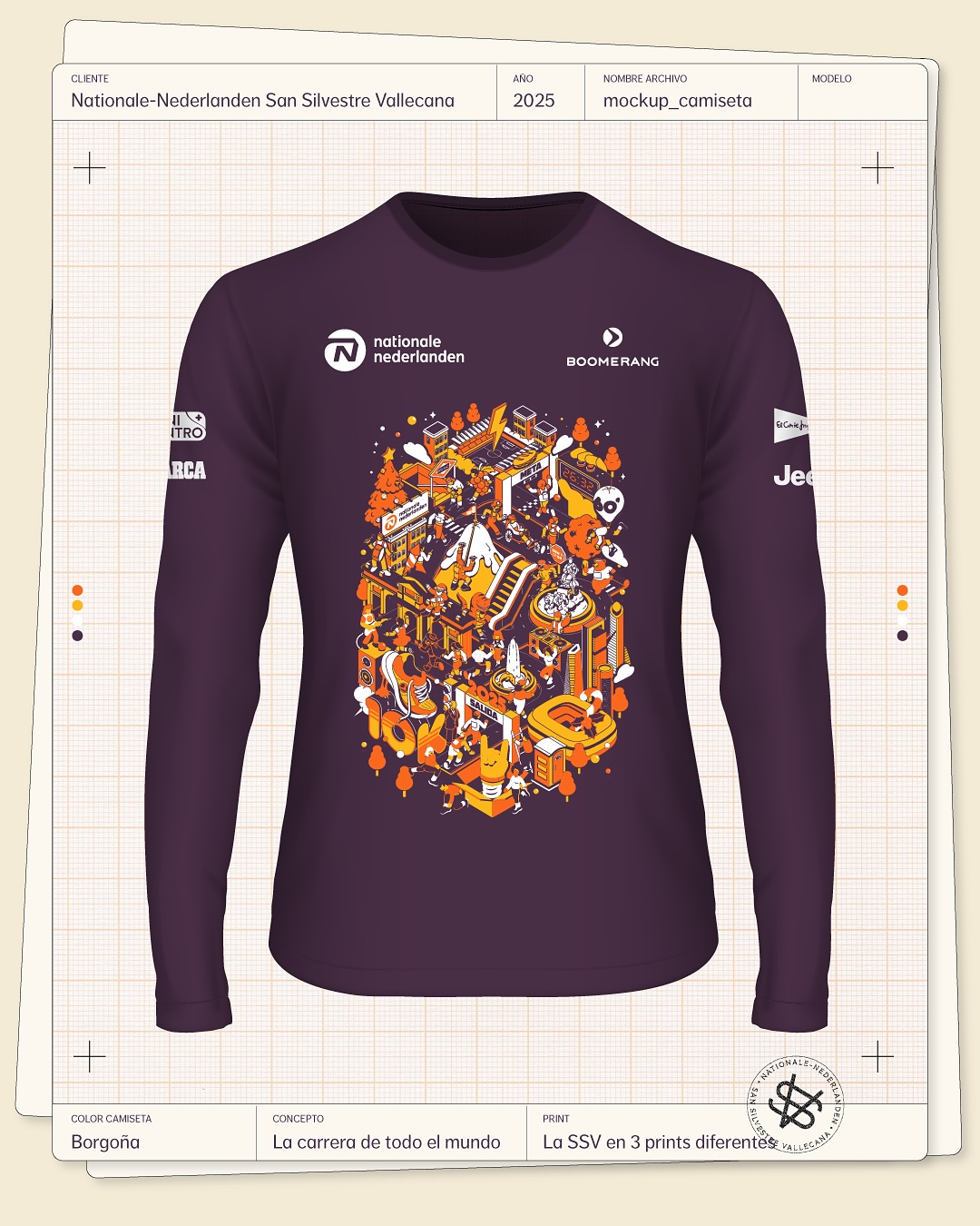 Cada 31 de diciembre Madrid se tiñe con el color de la Nationale-Nederlanden San Silvestre Vallecana. El diseño de su camiseta, un objeto de culto entre los deportistas fieles a esta cita atlética, cada año cubre con un color diferente el trazado de su recorrido. Con una participación que no ha dejado de crecer, hasta alcanzar en la pasada edición los 42.000 participantes inscritos, para su próxima celebración se ha elegido el lema ‘La carrera de todos’. Ese venerado maillot hace suyo dicho propósito para reflejar la diversidad y la conexión surgida entre los corredores.