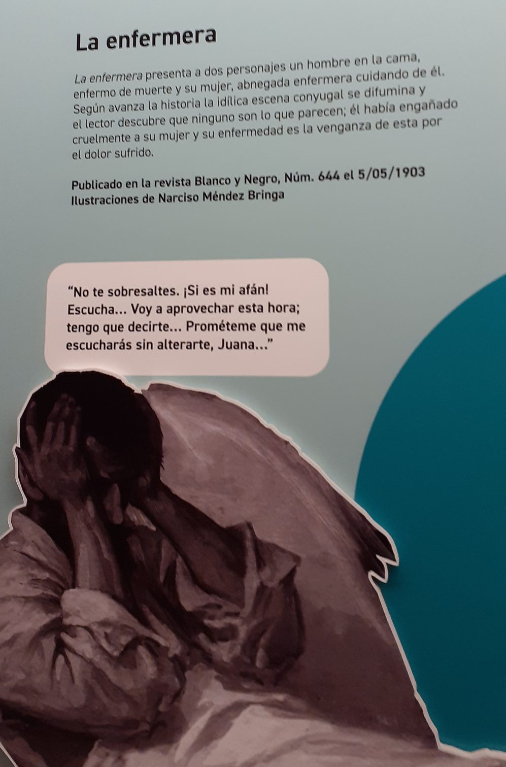 El recorrido por esta exposición nos acerca a catorce de los más de seiscientos cuentos que escribió Pardo Bazán a lo largo de su vida. Estos relatos cortos, que podemos ver en el centro cultural del distrito de Salamanca, vieron la luz entre los años 1896 y 1921 en la revista Blanco y negro. Además, la extensa obra de cuentos de Pardo Bazán también se pudo leer y disfrutar en un variado catálogo de periódicos y revistas de la época.