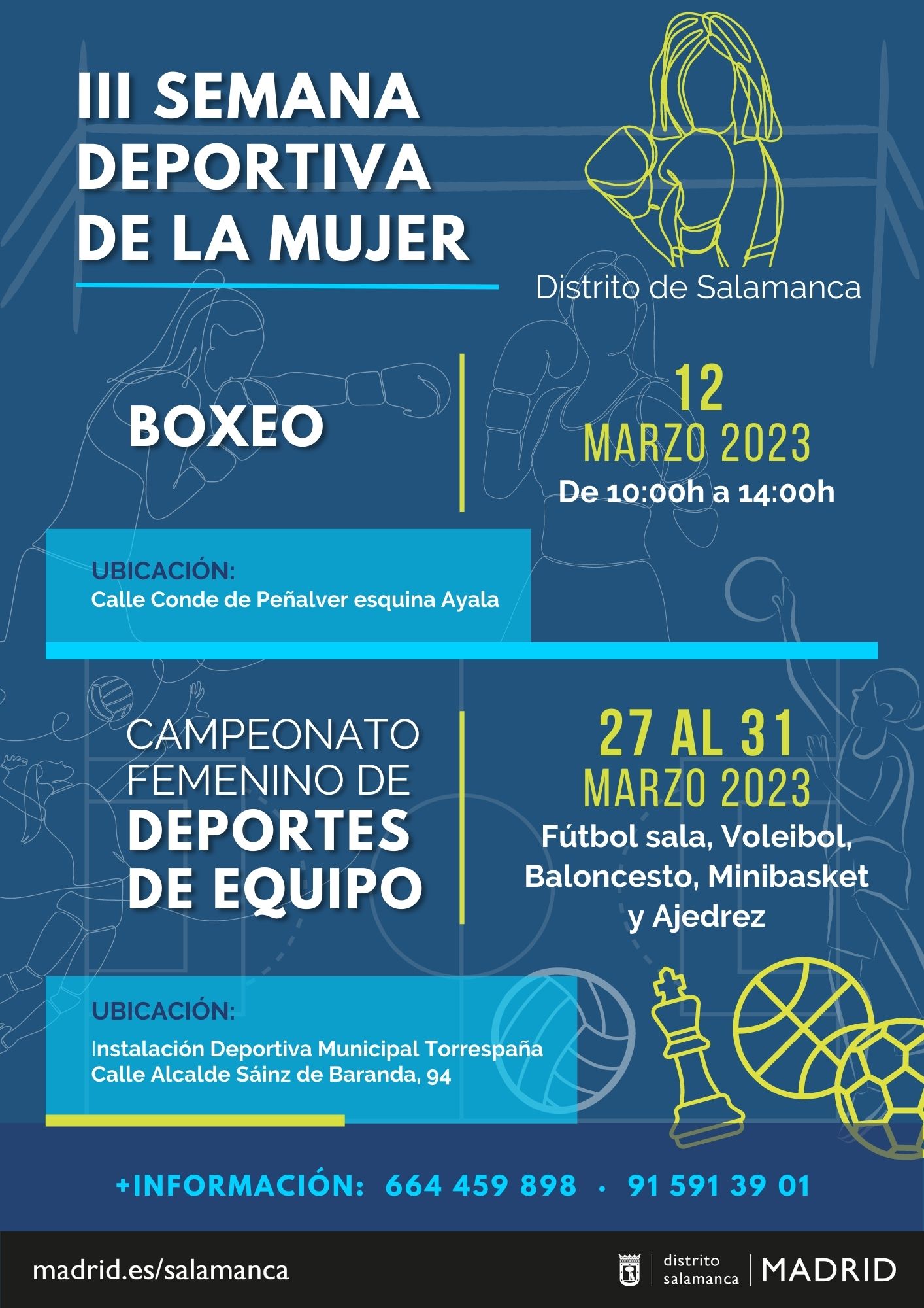 Con motivo de la III Jornada deportiva de la mujer, las asociaciones deportivas del distrito de Salamanca y la Federación Madrileña de Boxeo realizarán una exhibición de dicho deporte en la calle de Conde de Peñalver esquina con Ayala (de 10:00 a 14:00 h).