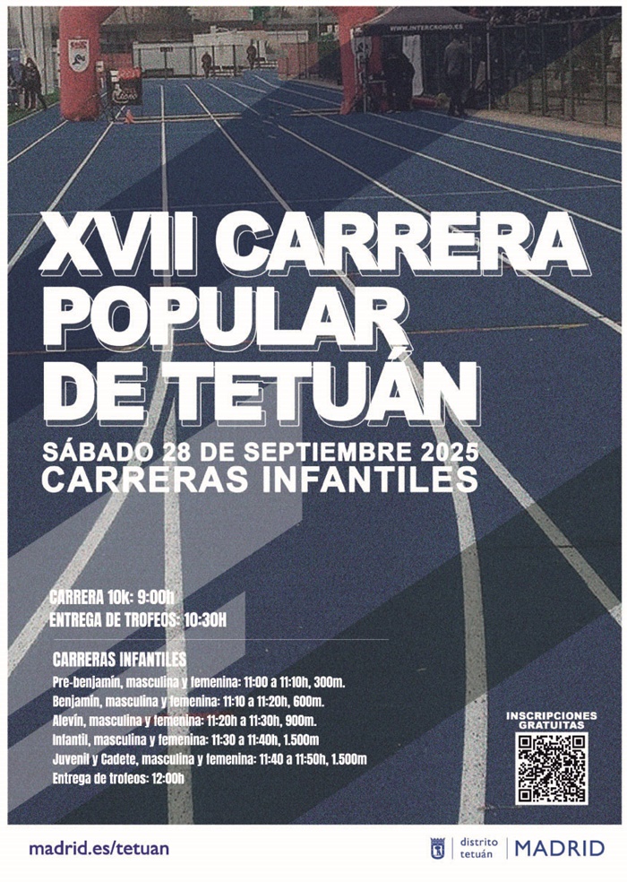 El domingo, 28 de septiembre, a partir de las 9 h, se celebrará la XVII Edición de la Carrera Popular de Tetuán, un circuito urbano íntegro por calle de Bravo Murillo, entre plaza de Castilla y la glorieta de Cuatro Caminos. La Junta Municipal de Tetuán será la salida y la meta de esta XVII edición que, con un recorrido de 10 kilómetros, hará disfrutar a los participantes, sean tetuaneros o no. Las inscripciones son gratuitas y se pueden realizar en este enlace desde el 1 de septiembre.