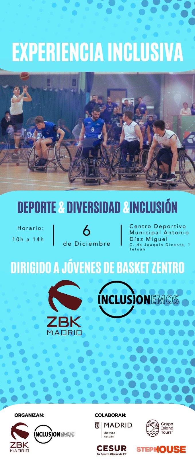 El CDM Antonio Díaz Miguel alberga el sábado, 6 de diciembre, el evento de baloncesto inclusivo organizado por Zentro Basket en colaboración con la Junta Municipal de Tetuán, en la semana en la que se celebra el Día Internacional de las Personas con Discapacidad (3 de diciembre). El distrito apuesta por el deporte de inclusión a través de esta iniciativa, un evento pionero en Madrid para demostrar cómo aunar y compartir los programas de entrenamiento y de educación de deportistas de élite, en este caso, baloncestistas en silla de ruedas.
