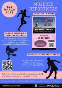 Vicálvaro se llena de movimiento con un programa deportivo pensado para celebrar el 8M, el Día Internacional de la Mujer. Si te gusta correr, llega una nueva edición del Cross de la Mujer el próximo sábado 22 . Pero si buscas otras actividades, el Centro Deportivo Municipal Faustina Valladolid ha preparado una jornada repleta de actividades gratuitas: ciclo sala, gimnasia acuática, pilates para el sábado 8. Y si este fin de semana no puedes asistir, ¡no te preocupes! El CDM Faustina Valladolid volverá a abrir sus puertas el sábado 15 con una jornada de promoción y competición de pickleball para mujeres.
