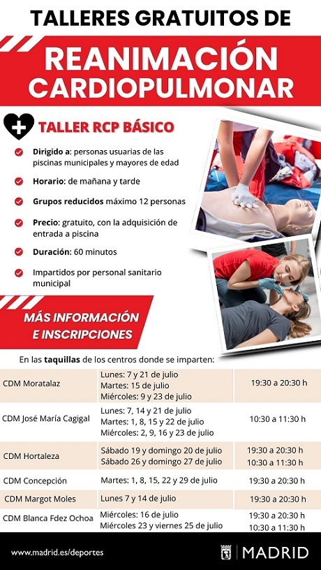 Como novedad, esta temporada se impartirán talleres de reanimación cardiopulmonar impartido por personal sanitario municipal durante el mes de junio. En la piscina del Centro Deportivo Margot Moles el taller será el próximo 14 de julio, en horario de 19:30 h a 20:30 h. ¿Te animas? Reserva tu plaza fácilmente al adquirir tu entrada para la piscina.