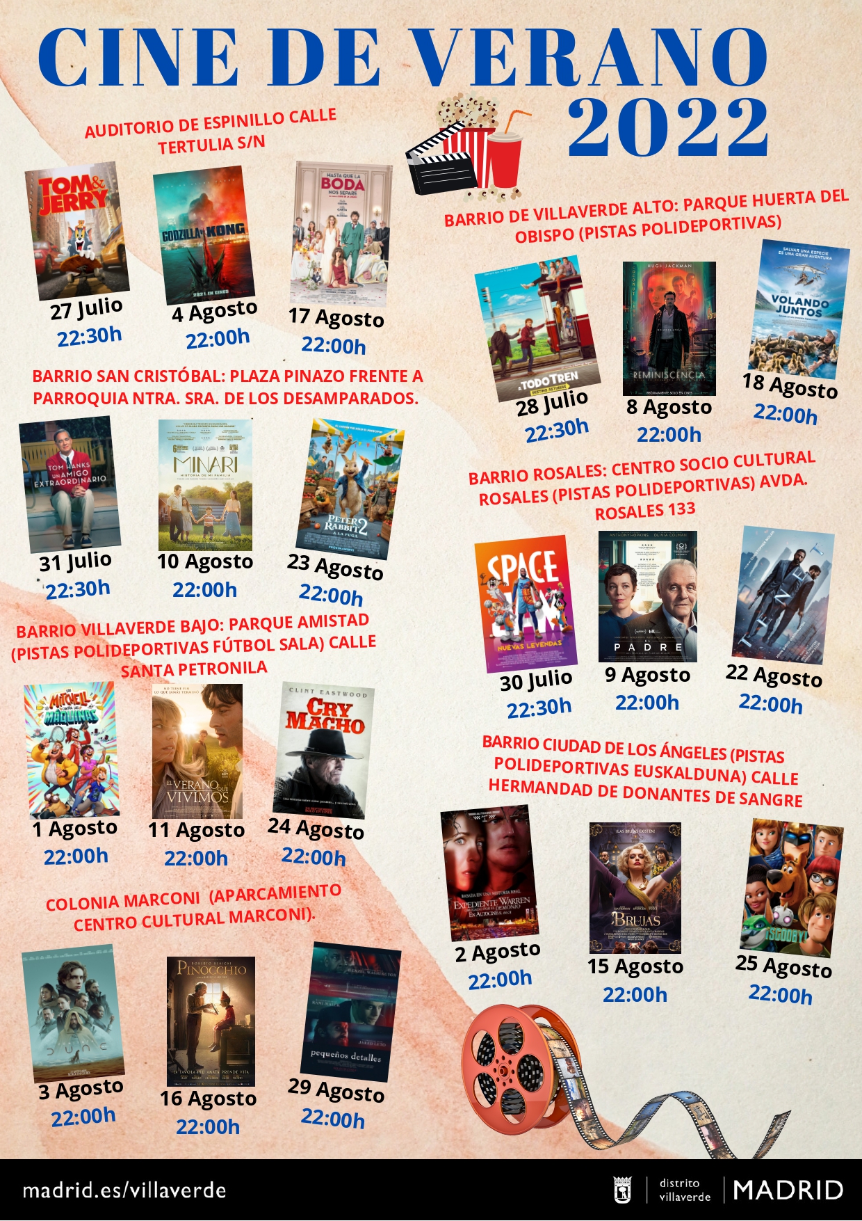 En cuanto a los horarios, las películas comenzarán a las 22:30 h en el auditorio de El Espinillo, el parque Huerta del Obispo, la plaza de los Pinazo y las pistas polideportivas junto al Centro Cultural Los Rosales, y a las 22:00 h en el parque de La Amistad, las pistas polideportivas Euskalduna y en Centro Sociocultural Marconi.