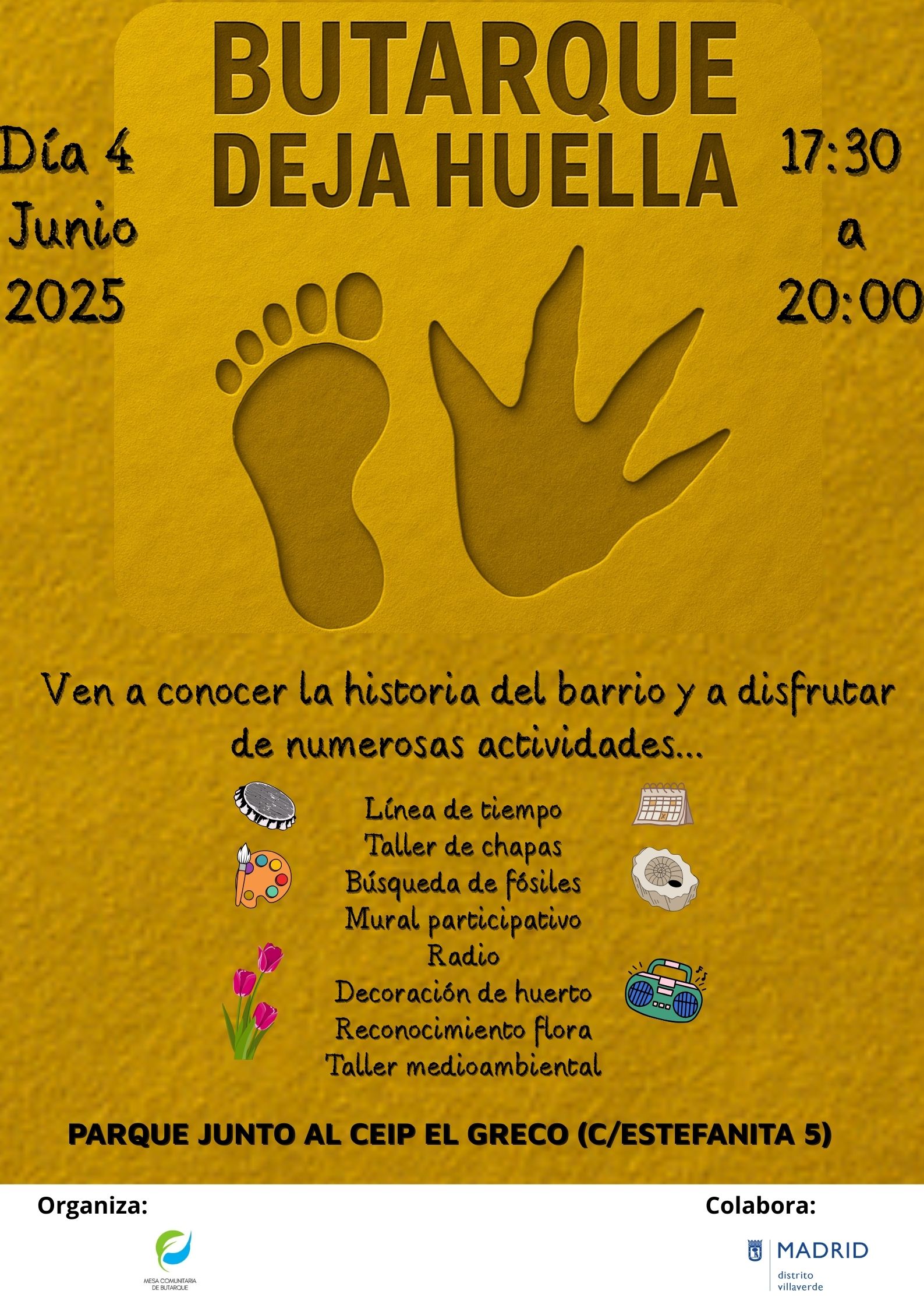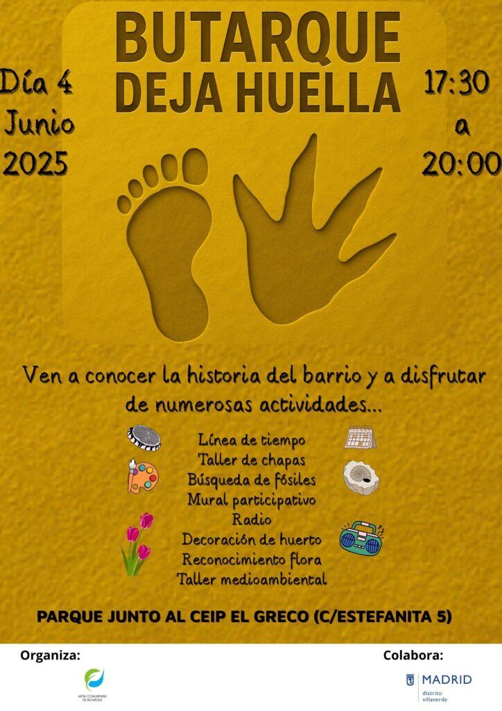 El próximo miércoles 4 de junio tendrá lugar la actividad comunitaria ‘Butarque deja huella’ en el barrio de Butarque, Villaverde, organizada por la Mesa Comunitaria del barrio, donde confluyen diferentes recursos, entidades y el tejido asociativo de la zona. En el nuevo parque junto al CEIP El Greco, se desarrollará la jornada entre las 17:30 y las 20:00 h, a la que pueden acceder los vecinos libremente.
