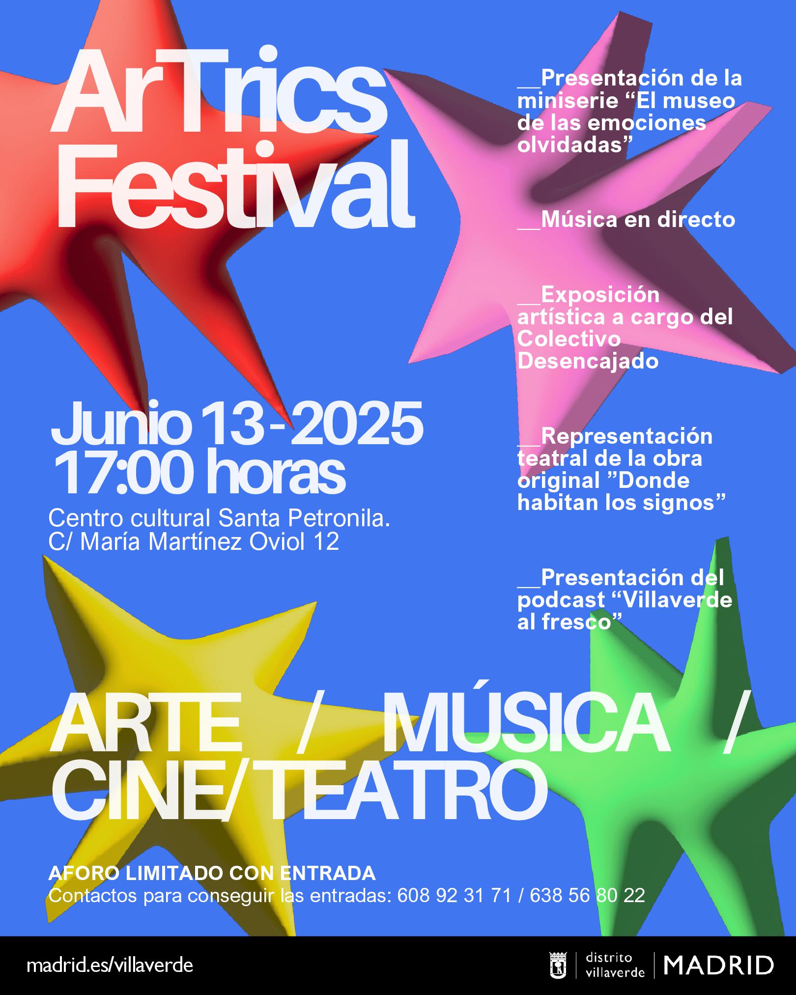 Para celebrar el fin de curso, el viernes 13 de junio, el distrito acogerá el Festival ArTrics, en el que los alumnos de este año darán a conocer las obras que han realizado durante un trimestre en el que el arte, la música, el cine y el teatro han llenado las aulas de los centros culturales de Villaverde.