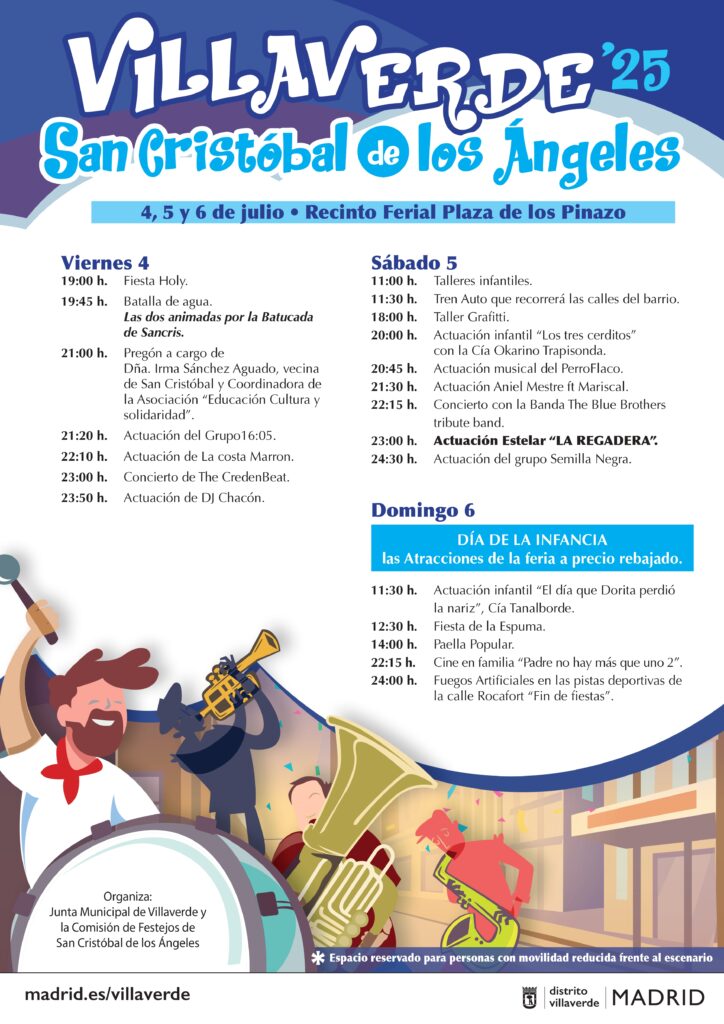 El mes de julio trae a Villaverde el inicio de las Fiestas de San Cristóbal de los Ángeles, que se celebrarán del 4 al 6 de julio en el recinto ferial de la Plaza de los Pinazo. El verano viene con la celebración en los barrios del distrito y tras el éxito de las fiestas de Butarque, Los Ángeles y Marconi, llega el turno de Sancris.