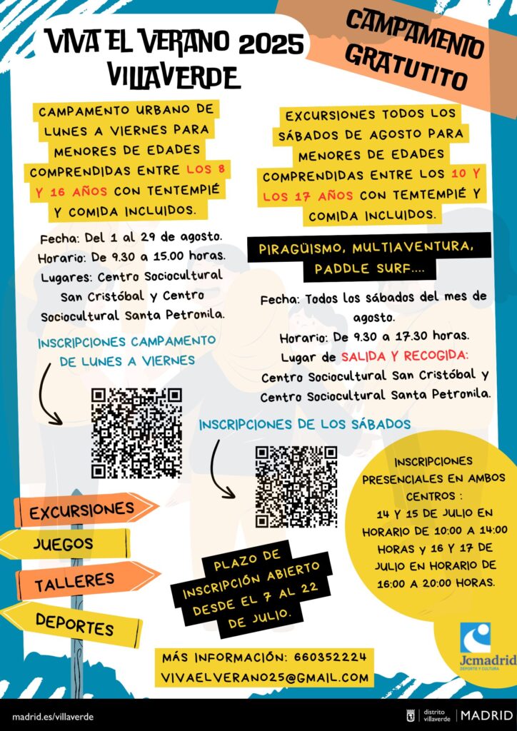 La Junta Municipal de Villaverde ha organizado para el mes de agosto el campamento urbano gratuito ‘Viva el Verano’, que se compondrá de dos alternativas, bien entre semana o bien los sábados, con los que ofrecer alternativas de ocio para los jóvenes y facilitar la conciliación de las familias del distrito.