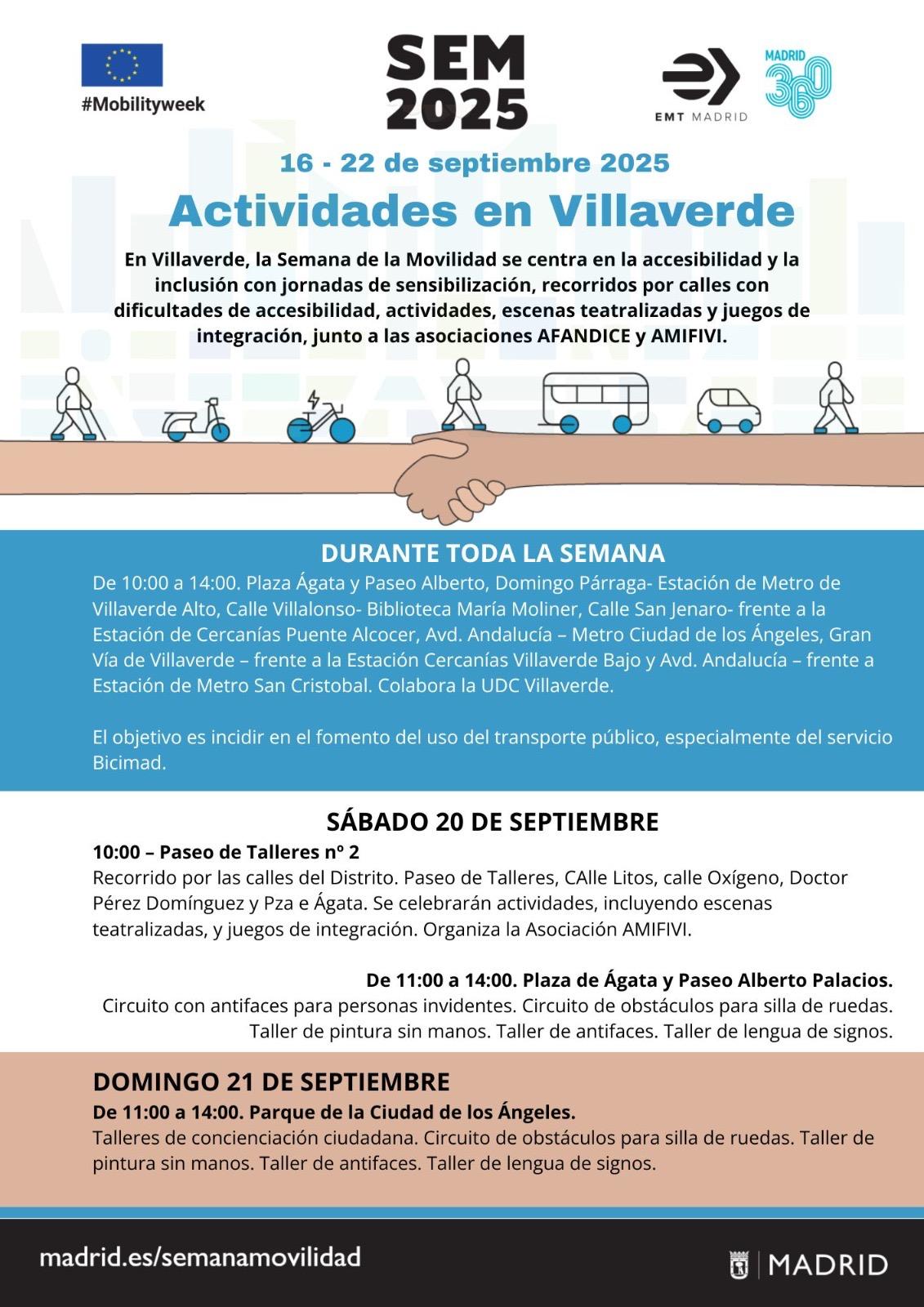 En Villaverde, la Semana de la Movilidad se centra en la accesibilidad y la inclusión con jornadas de sensibilización, recorridos por calles con dificultades de accesibilidad, actividades, escenas teatralizadas y juegos de integración, junto a las asociaciones AFANDICE y AMIFIVI.