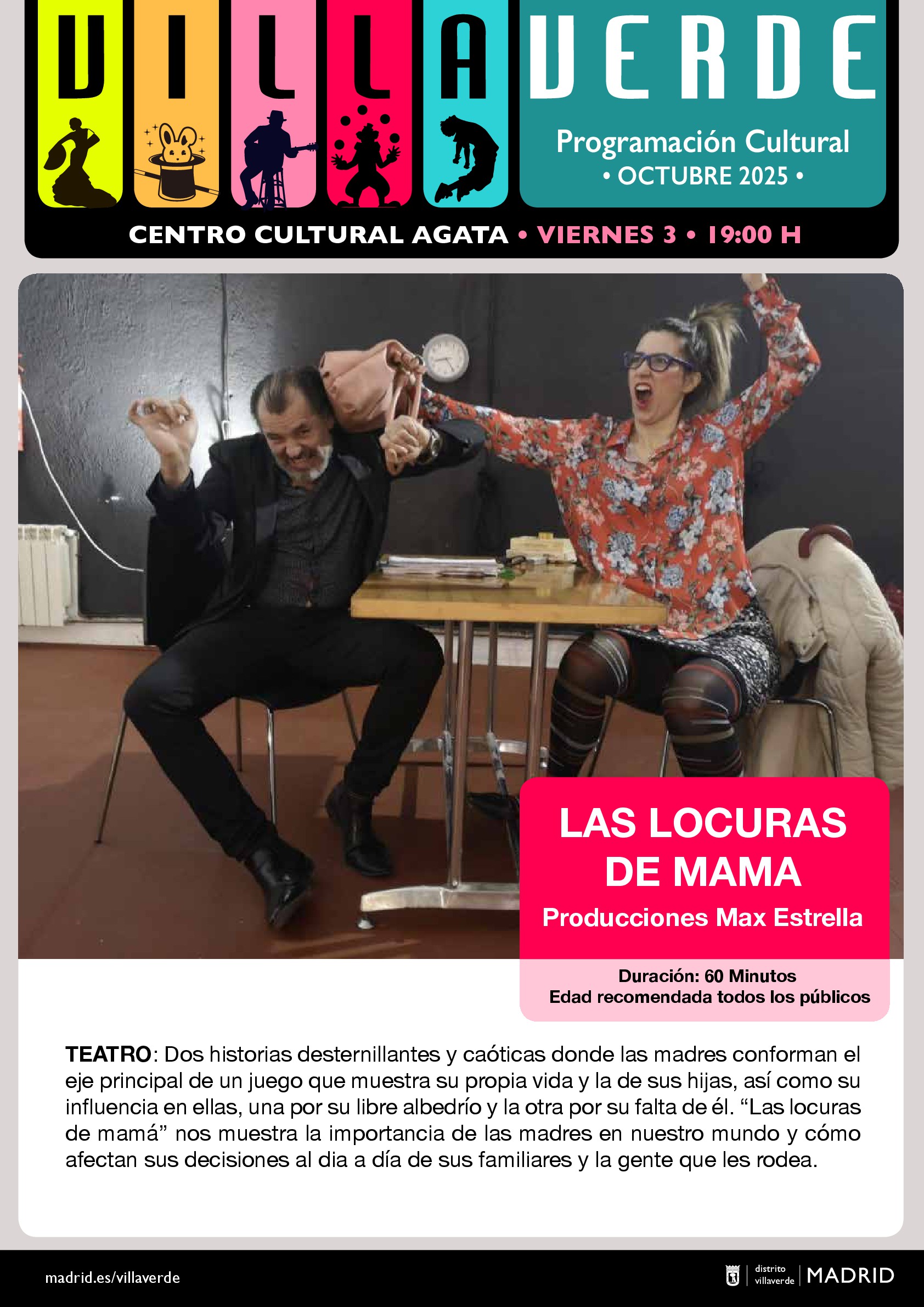 Producciones Max Estrella trae a Villaverde dos historias desternillantes y caóticas donde las madres conforman el eje principal de un juego que muestra su propia vida y la de sus hijas, así como su influencia en ellas, una por su libre albedrío y la otra por su falta de él. Una obra para poner en valor el papel de las madres en el día a día de las familias.